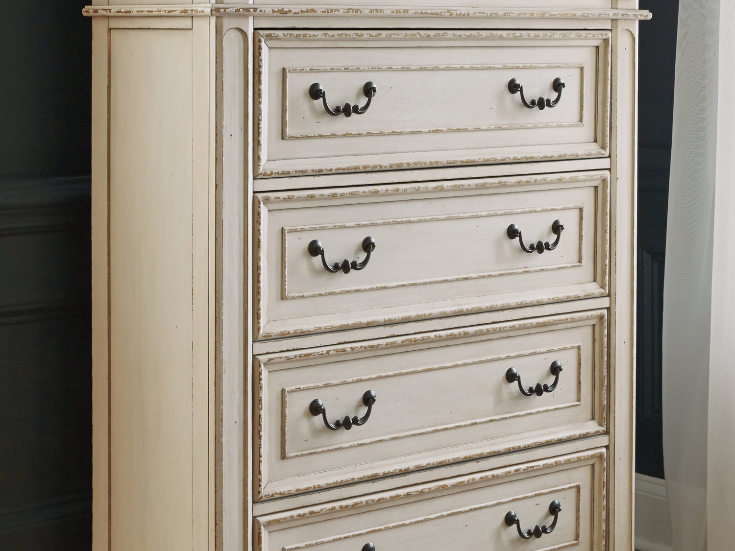 Realyn Chipped White King Panel Upholstered Bed, Dresser, Mirror And Chest