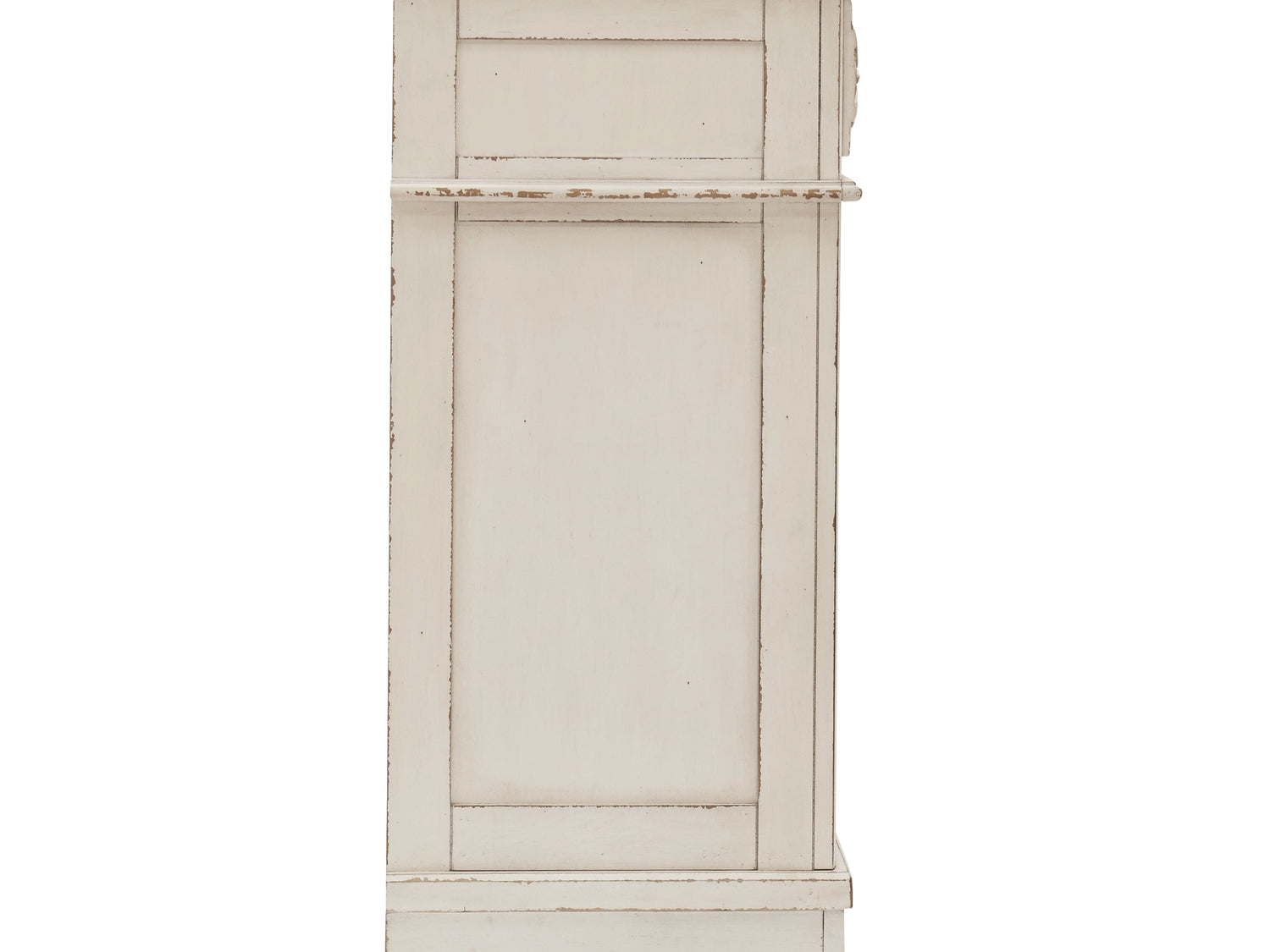 Series Features: Traditional cottage design. Antiqued two-tone finish featuring chipped white cases with distressed wood finished tops. Tops feature Oak veneers, while the cases are made with engineered wood substrates and Poplar solids. Framed drawer fronts and overlay decorative corbels dress the cases nicely. Ornately shaped headboard with inset upholstered cushion and matching mirror frame. Dovetail drawer construction with ball bearing side glides. B743-93 night stand features an AC power supply with dual USB charging ports. B743-22 (3) drawer vanity, mirror, linen colored upholstered stool. Vanity mirror dimension: 28"W x 1"D x 26"H. Vanity stool dimension: 19"W x 14"D x 18"H. B743-54S/56S double storage drawer footboard features ball bearing side glides and cushioned top rail. Storage footboard and side rails are compatible with the in-line headboard. The bench rail is 8” deep.