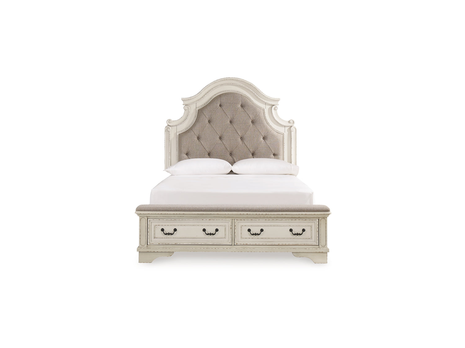 Realyn Two-Tone Queen Upholstery Panel Bed, Dresser, Mirror And Nightstand