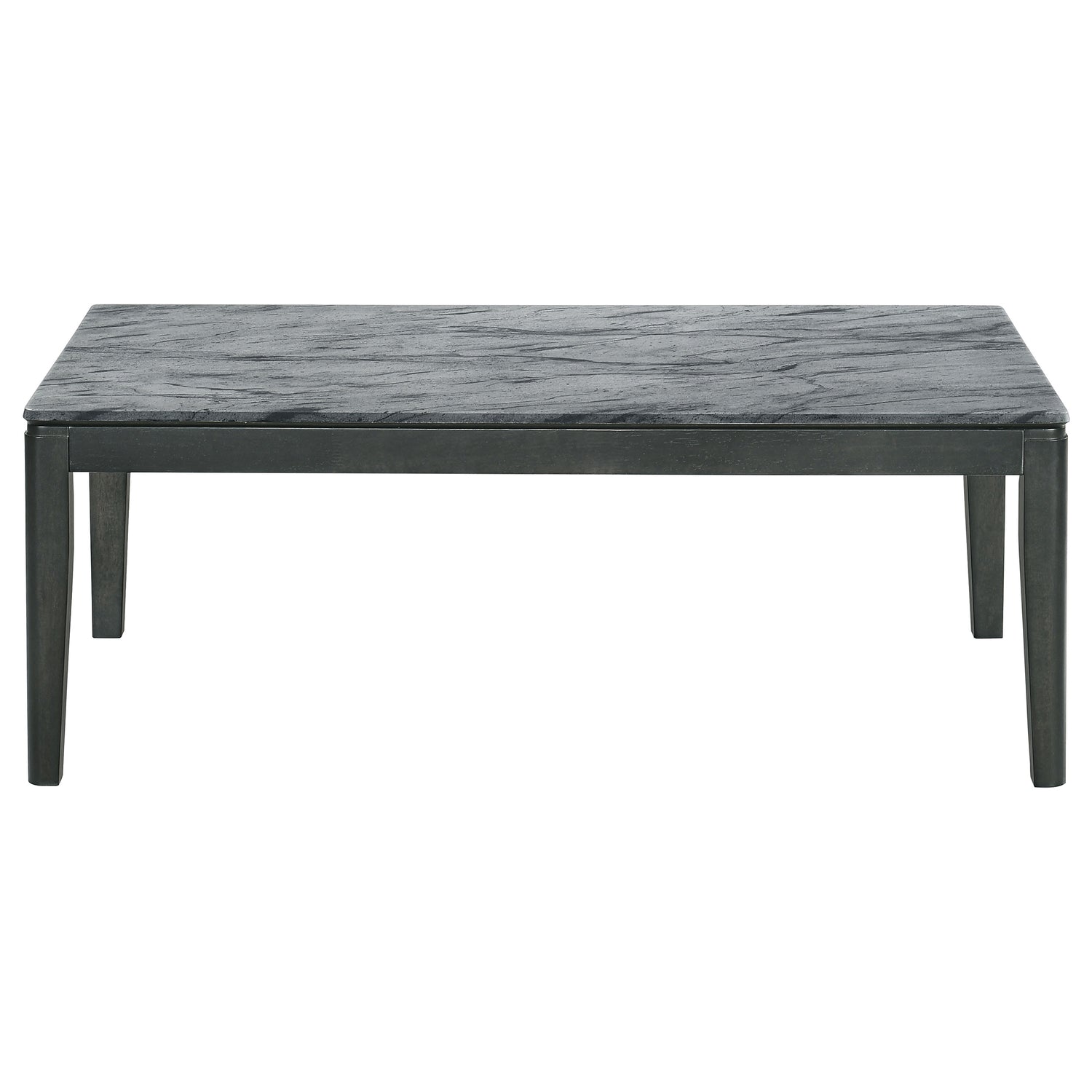 Transform a contemporary space into a minimalist home with this chic modern coffee table. This sophisticated coffee table features a spacious rectangular top that offers a faux grey marble design with realistic-looking striations and a sandy feel. The surface offers ample room for resting a drink, a tray of refreshments, or a tablescape of potted plants and decor. Elegant, slim legs project from aprons, all in a smooth black finish that offers a lovely contrast. Place this coffee table in an industrial style living room to complete a stylish seating arrangement ensemble.