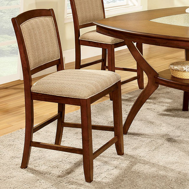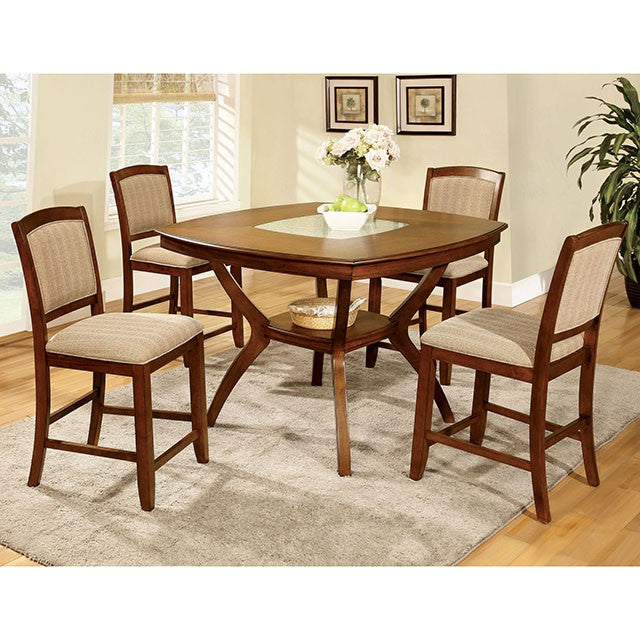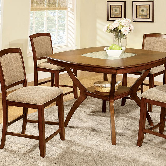 A beautiful cracked glass insert at the center of the table top is the centerpiece of this unique dining set. An open shelf underneath and angled legs add more flair to an already remarkable design. It seats four comfortably and is also available in regular height.