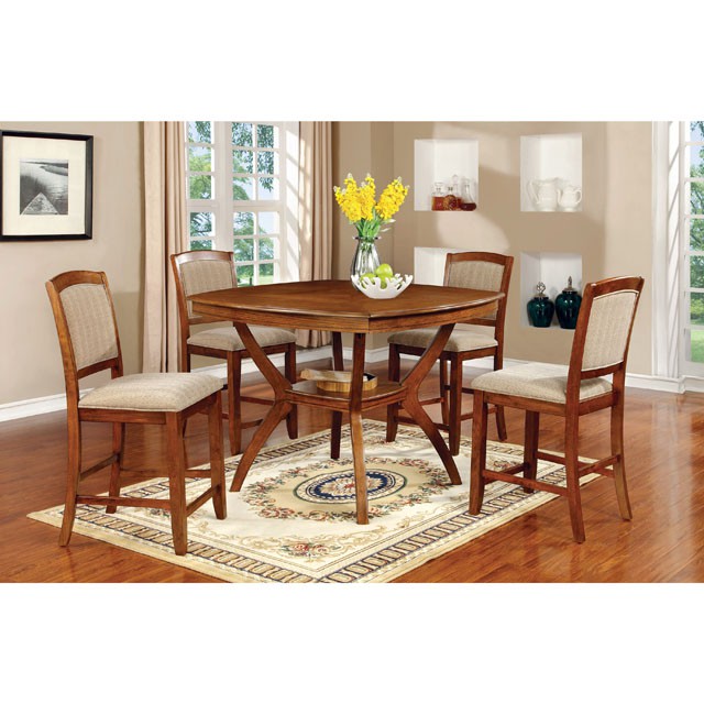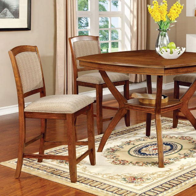 A perfect table and chair set for any kitchen or dining room. This transitional style table has a convenient bottom shelf with matching chairs upholstered in comfortable padded fabric.
