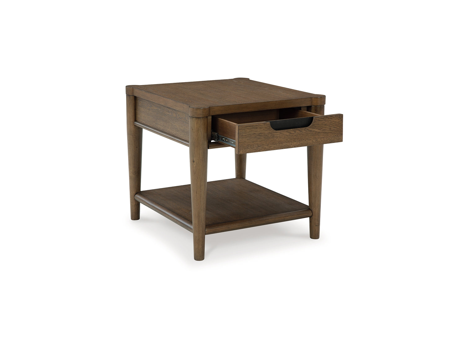 Series Features: Mid-Century Modern design. Made from Rubberwood solids, Oak veneers and MDF substrates. Clean and classic brown finish to enhance the wood grain for a great mid-century modern look. Cocktail and end table feature eye-catching rounded corners, turned legs, and soft radius accent on the apron. Drawers have fully finished interiors with ball-bearing side glides. Lower shelves offer spacious display space.