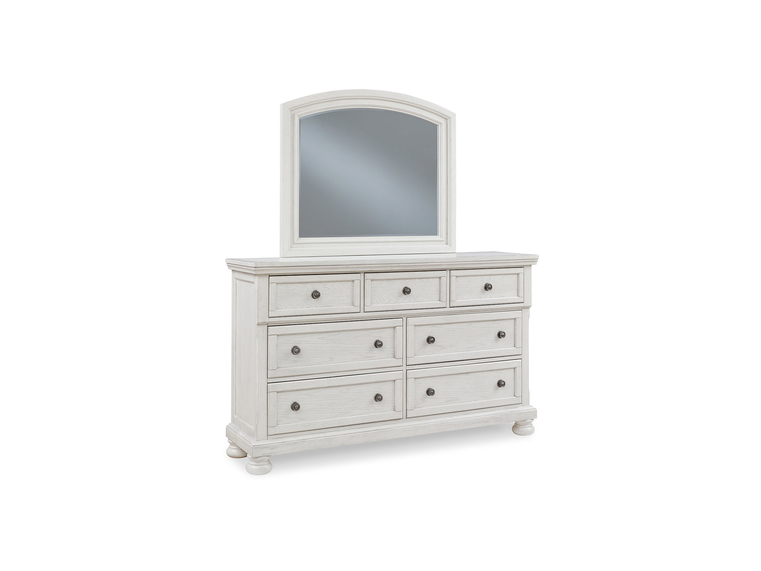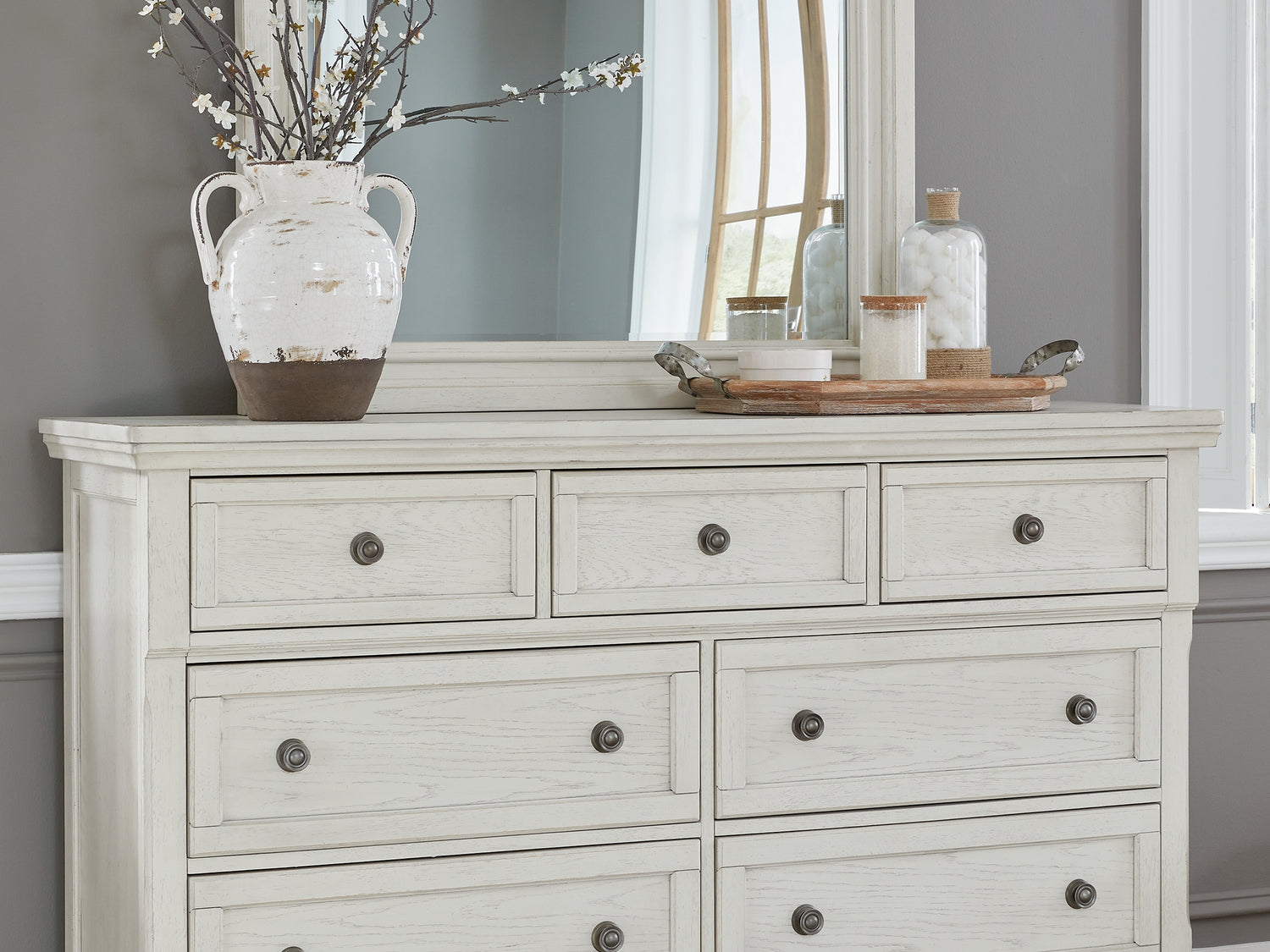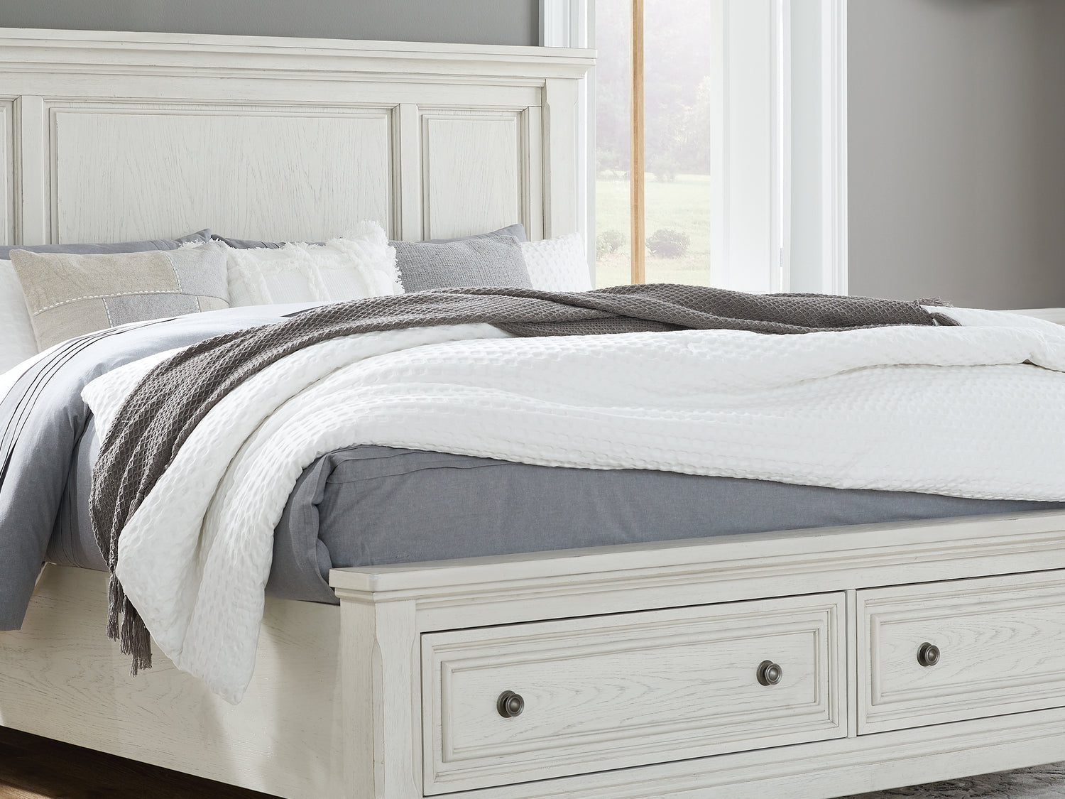 Robbinsdale Antique White King Panel Storage Bed, Dresser And Mirror