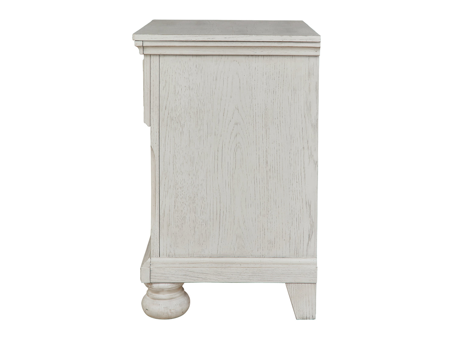 Series Features: Timeless traditional design. Made with select Oak veneer, MDF and solid wood components. Antique white finish with a wonderful grain texture. Dovetail drawer construction with metal ball bearing side glides and dark bronze-toned knobs. Upper drawers feature felt bottoms. Both the sleigh headboards (77/78) or panel headboards (57/58) can use either storage footboards (74/98 and 76/99) and panel footboards (54/96) and 56/97). Loaded with extra features such as concealed drawers for keeping valuables out of sight. Available twin and full sleigh beds feature storage footboards to make the most of smaller space bedrooms. B742-91 one drawer nightstand has an open bookcase cubby with a cord management hole located in the back panel. B742-22 vanity and stool set with three storage drawers and a soft cushioned seat covered with a woven polyester fabric. Special features include a hidden jewelry tray in the center drawer of the dresser, and a concealed pull-out tray in the nightstand. Twin over full bunk bed with a large capacity underbed storage box set on casters to easily pull in and out. Dovetail drawer box construction with dark bronze-toned knobs and black felt bottom.