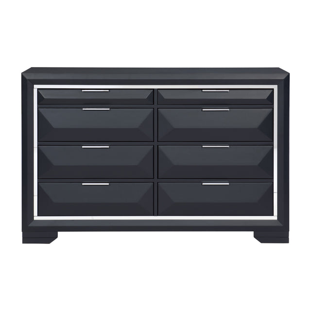 Your bedroom will have quite the presence with the rosemont collection's eye-catching appearance thanks to its cutting-edge modern design. the chrome banding that defines the front of the dresser reflects the midnight blue finish that runs throughout the dresser. each of the raised drawer fronts is accented with pull hardware finished in chrome.