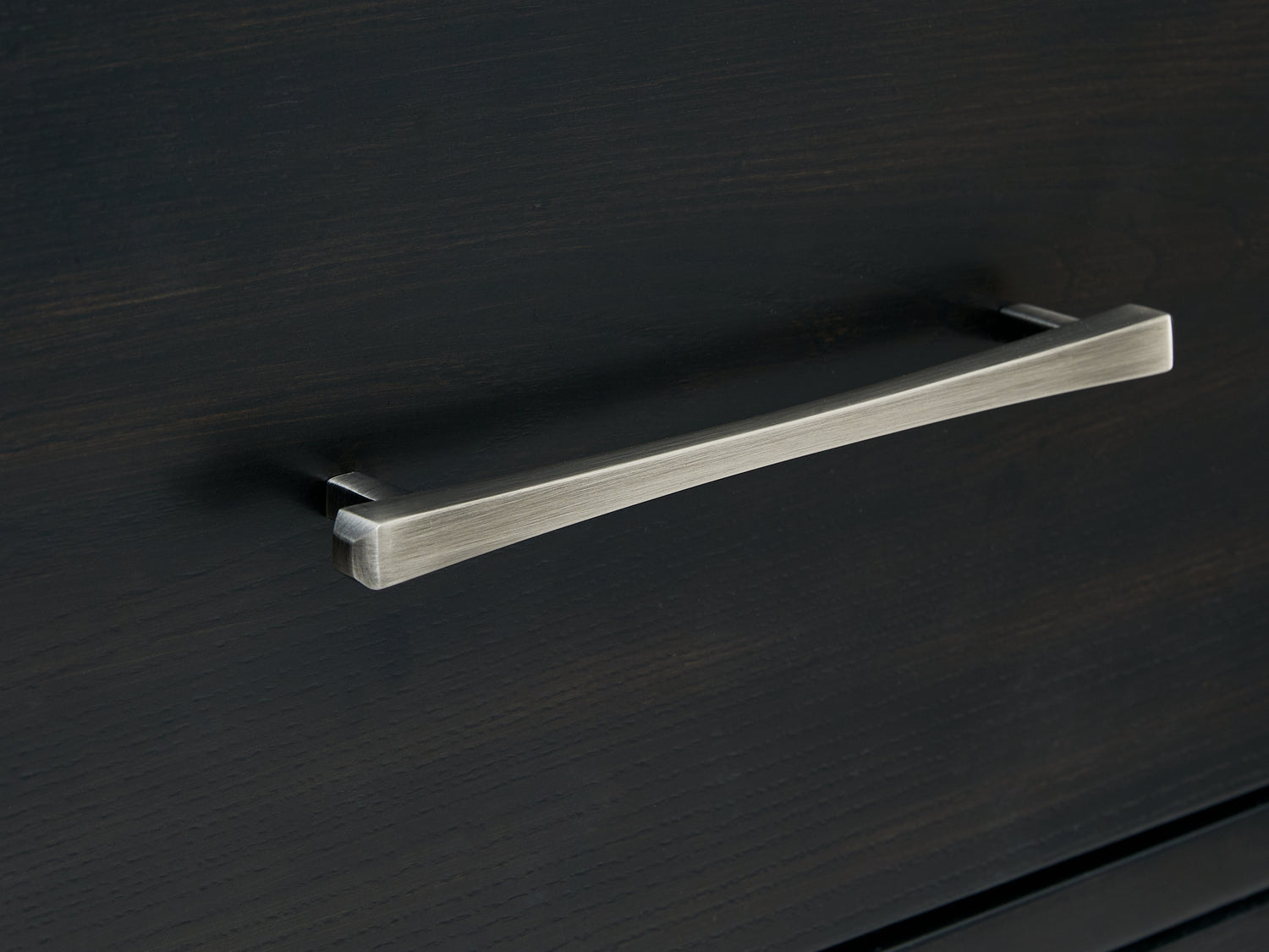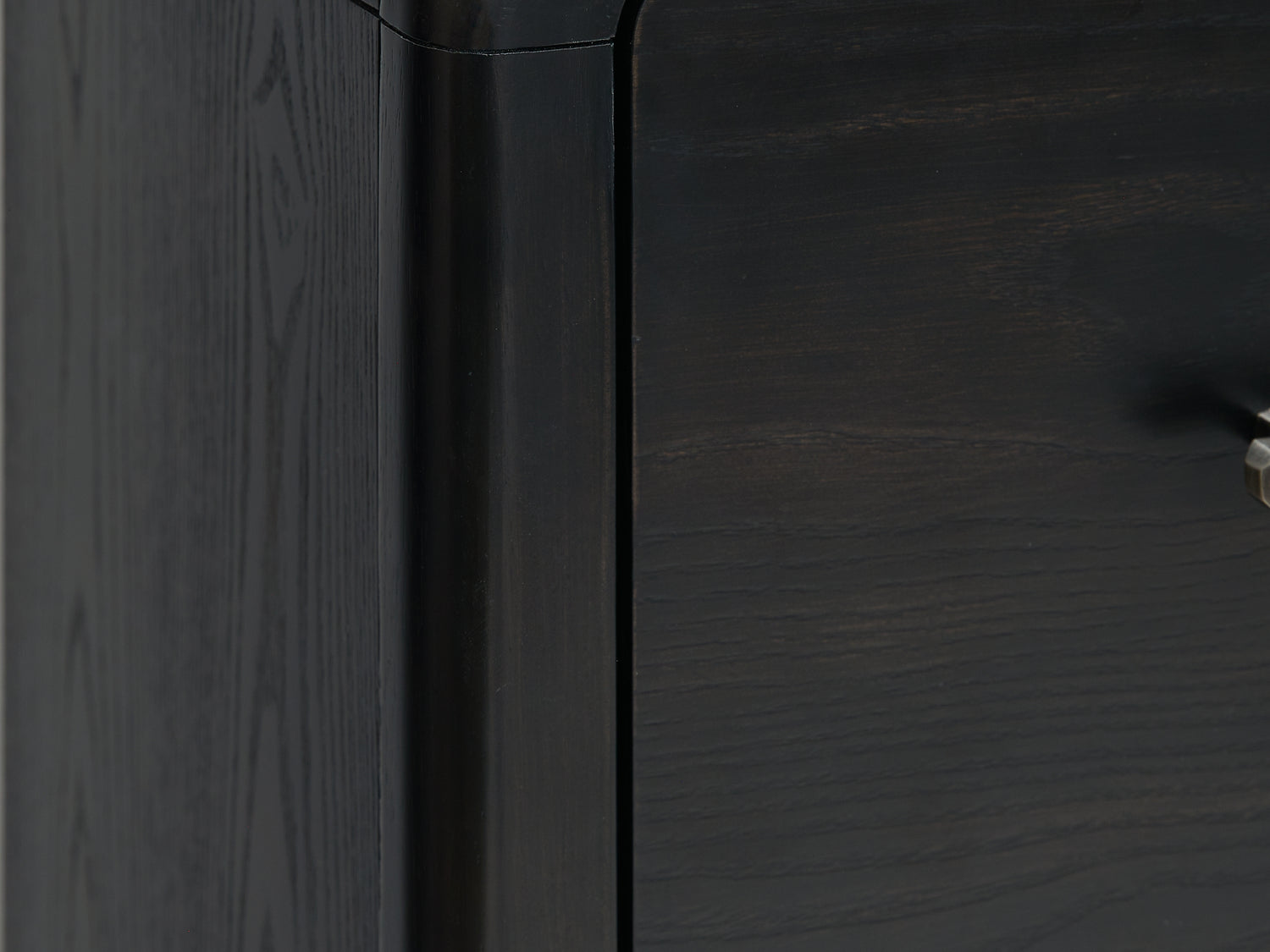 Series Features: Contemporary lifestyle design. Made with hardwood solids and Ash veneer. Rich layered black finish on textured wood grain surface. Collection is inspired by Art Deco design elements such as softly shaped cases with waterfall edges and channeled upholstered headboard. Drawers feature French/English drawer construction, fully finished interiors and heavy duty ball-bearing side glides. Upholstered bed features channeled headboard cushion and footboard in a gray herringbone textured fabric. One drawer nightstand includes a 110V power supply with USB-A and USB-C charging ports, and an LED night light located inside the lower cubby shelf.