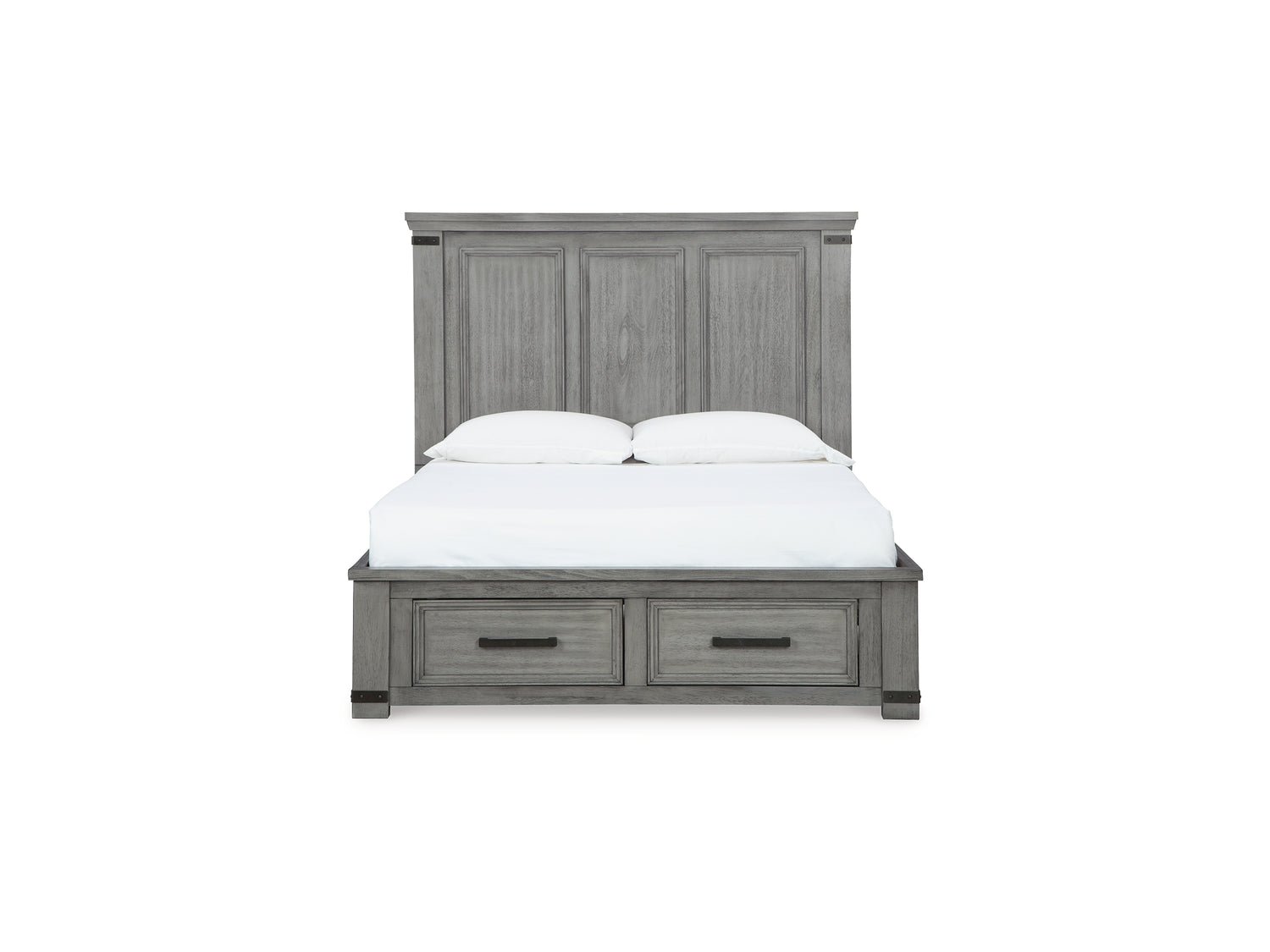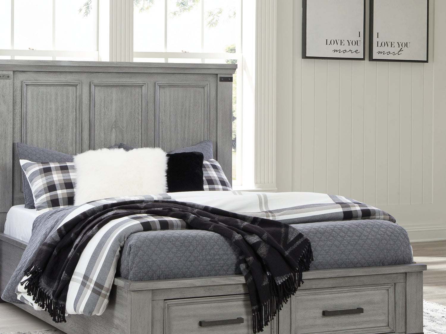 Series Features: Urban Farmhouse styling. Made with Acacia solids and veneer with engineered wood substrate. Finished with a light weathered gray coloration accented with dark aged bronze bar pulls and metal straps. Dovetail drawer construction with metal ball-bearing side glides. Profiled drawer frames, thick profiled top moulding and tapered legs earmark a timeless case design. The tall mansion scale bed features storage drawers in the footboard. The two drawer nightstand includes a 110V power supply with dual USB charging ports.