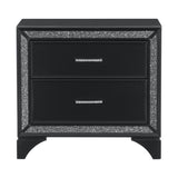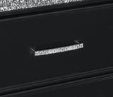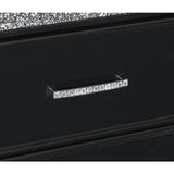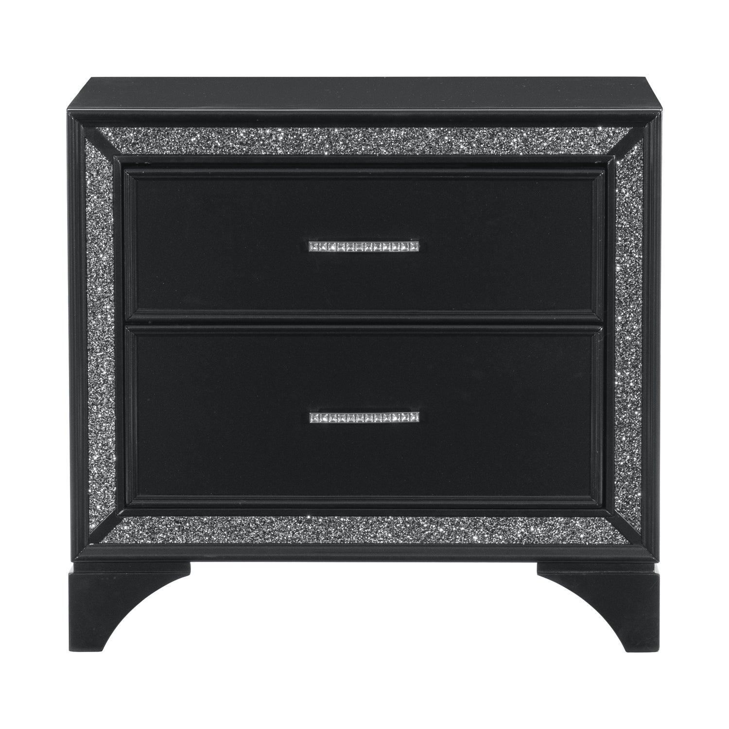 When you bring items from the salon collection into your bedroom, you instantly elevate the space to a glamorous new level. the faux-crystal chrome bar hardware handles that front each drawer, in addition to the sparkling silver glitter trim that frames the nightstand, contribute to the overall enhancement of the nightstand's black pearlescent finish.