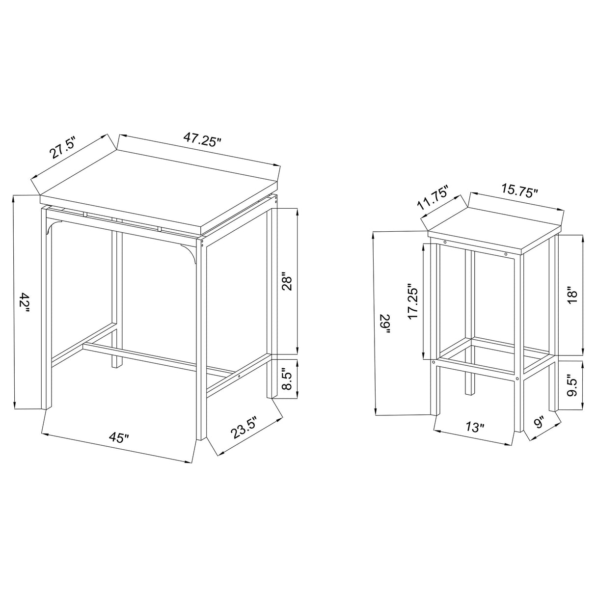 Sleek in style, this five-piece bar set offers instant elevation to any small space. Smooth metal legs feature a dark hue and clean lines. Resting on top of the open base are smooth seats and a top in weathered chestnut. Create elevated dimension with the subtly exposed wood grain. Make a beautiful statement with the industrial-inspired details from this stylishly modern set.