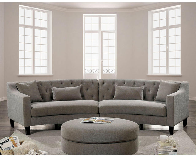Create a luxurious and sophisticated living room with this uniquely shaped sectional . Curved for design and comfort, the sectional features a tufted back paired with sloped armrests, all for a modern appeal. Matching accent pillows, available in two different sizes, add a charming touch.