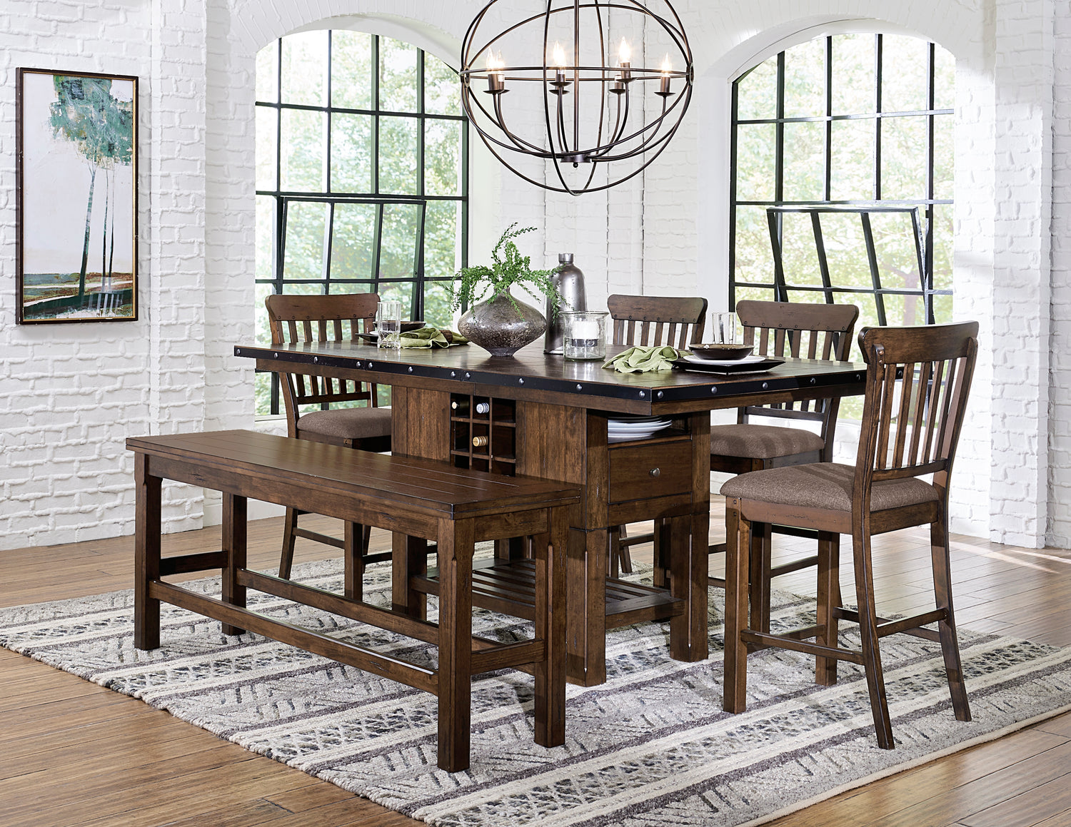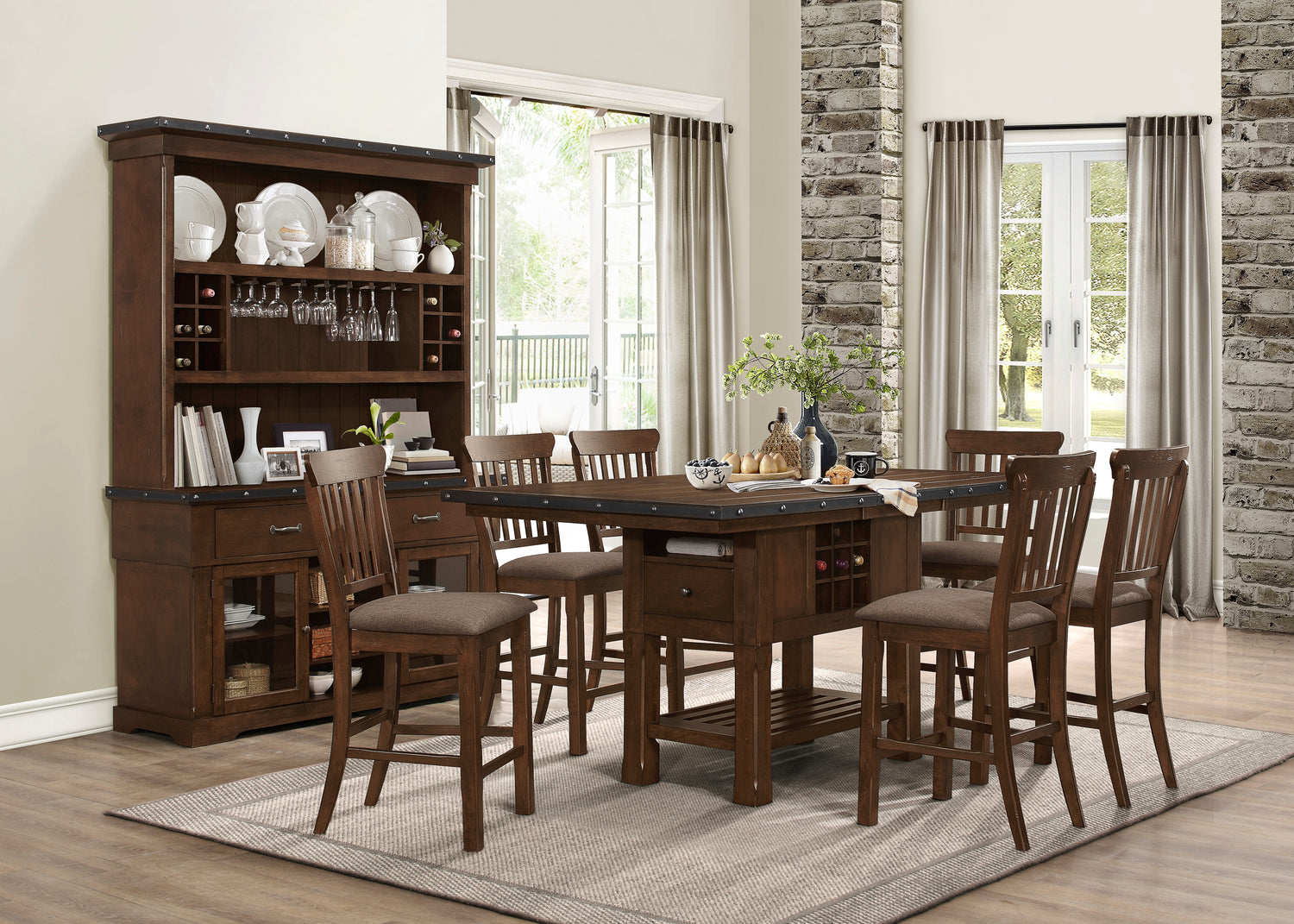 The schleiger collection is a transitionally inspired furniture line that comes in a burnished brown finish. it has dramatic accenting and useful storage solutions.the availability of a bench at counter height enables a variety of seating arrangements to be created.