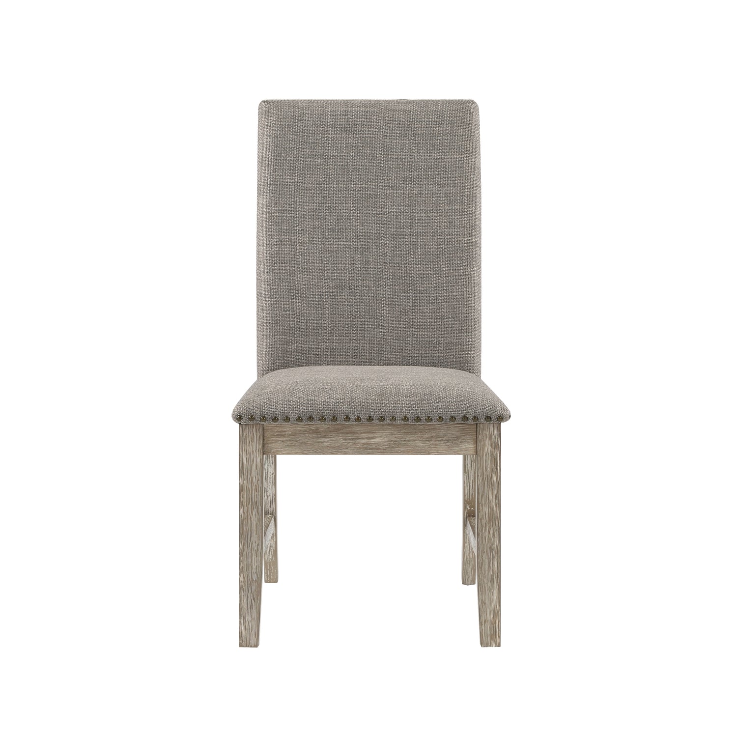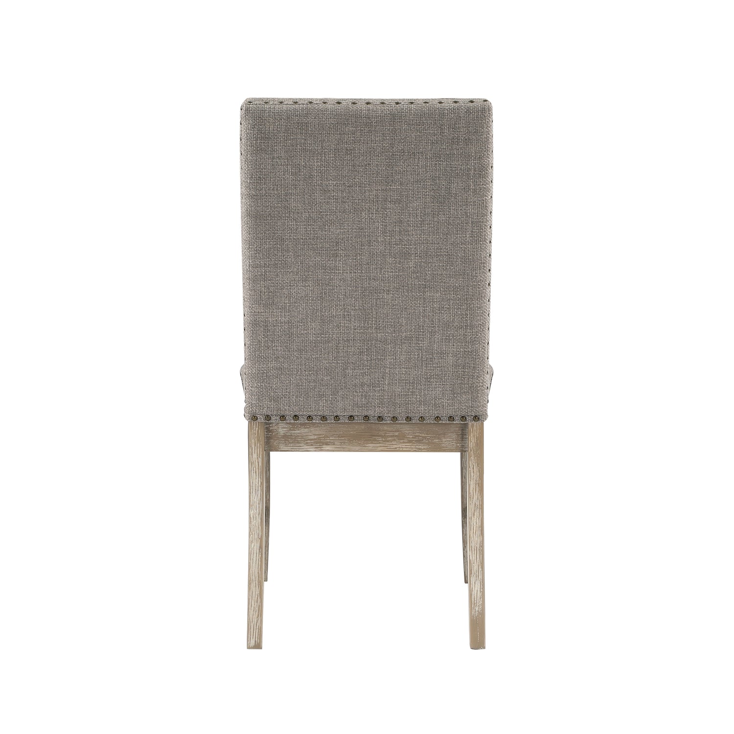 An elegant blend of traditional styling and rustic aesthetic combines to create the look of the Southlake Collection. The wire-brushed brownish-gray finish of the chair legs highlights the oak veneer. The collection features solid wood construction. The light gray linen-covered seat and back of the side chair provides neutral complement to your dining space.