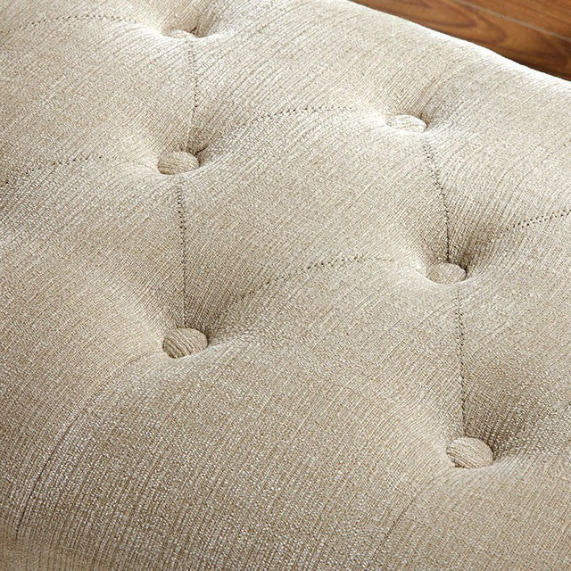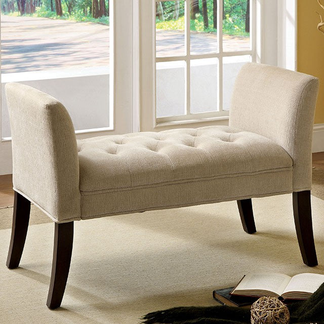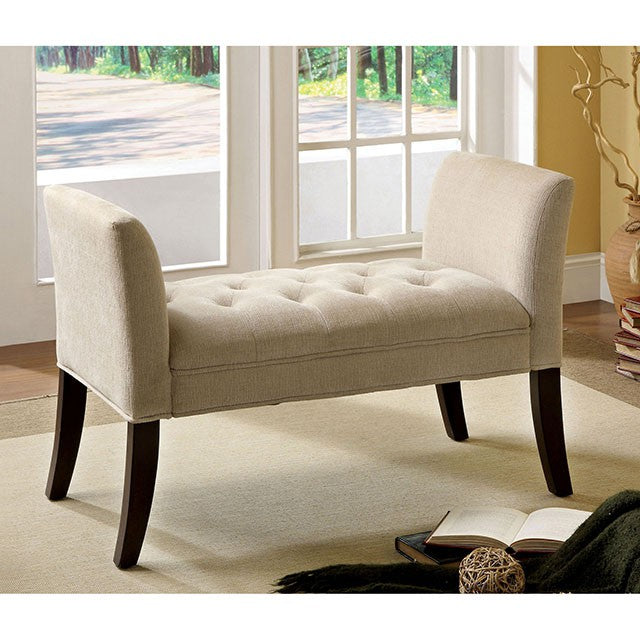 Accent a hallway or bedroom with this attractive button tufted bench with curved arms and flared legs. The bench is upholstered in an ivory fabric and the legs are finished in deep espresso.