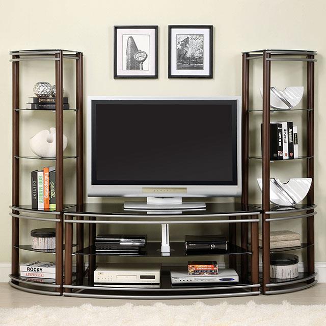 This handsome media center has a mixed media look, open shelving for easy access to media components and black glass shelving for display. Two pier shelves are sold separately. Finished in brown and silver.
