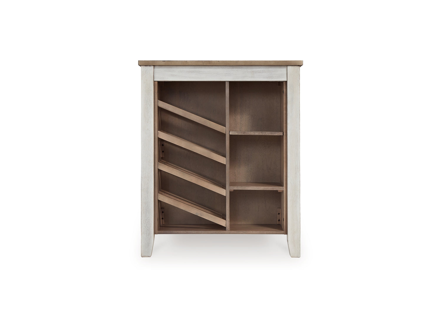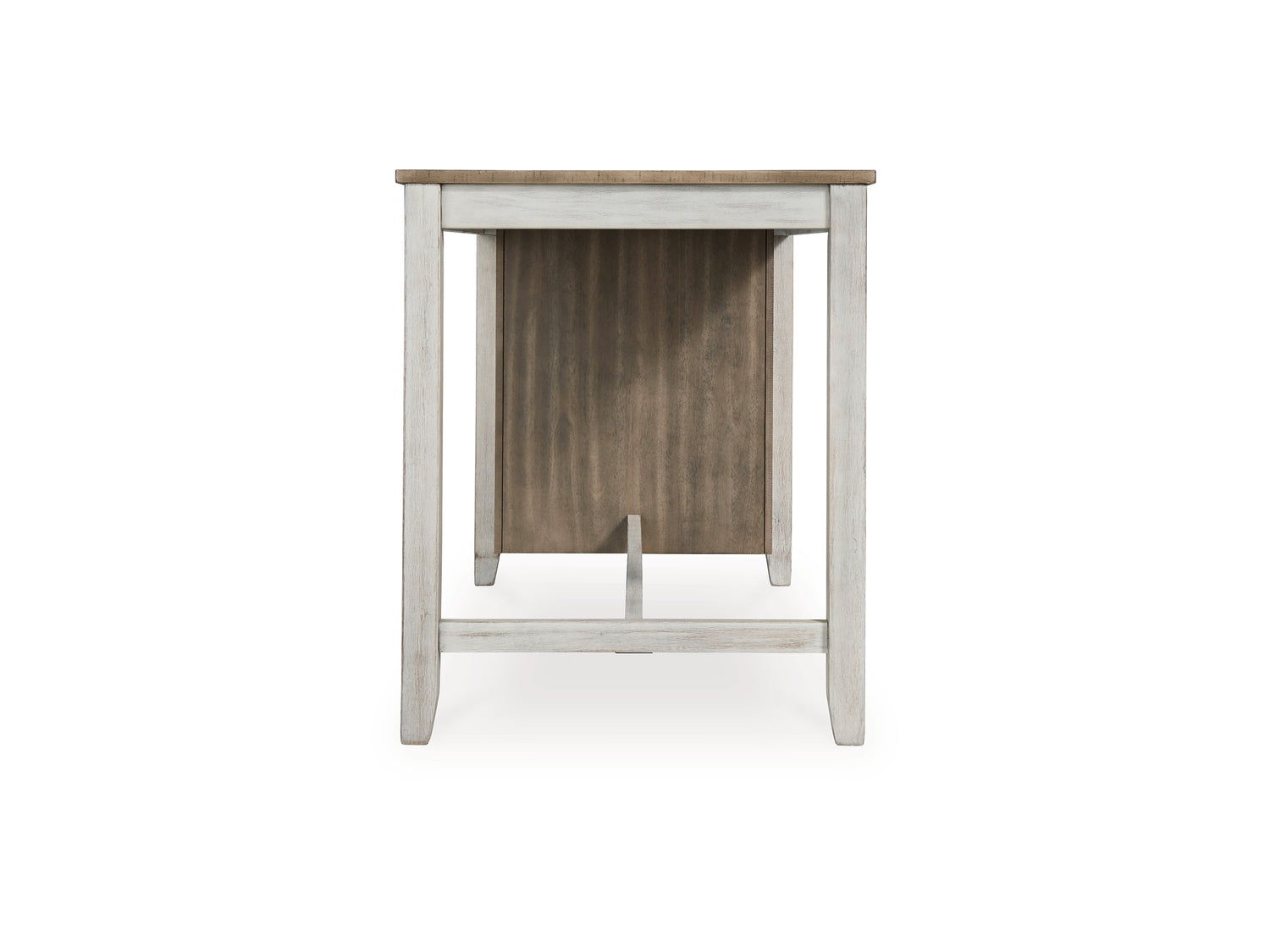 Series Features: Made with Acacia veneers and select rubberwood solids, in a grayish white finish with rub through effect for a time worn appearance. Top is finished in a medium toned brown color with a planked effect with saw kerf distressing. Chair has a classic casual design with a tall ladder back look with simple features. Seat is covered in a light colored fabric cover. D394-32 pairs with 4 counter height stools. Built-in 8-bottle wine rack and open shelves. D394-024 cushioned saddle seat with a light textural polyester fabric. D394-113 barstool dimensions: 21"W x16"D x 24"H. Multi functional dining table features two convenient side drawers and a storage bin on each end for maximum use of space. Storage on the ends for maximum use of space. Finished in a trend right gray washed color with contrasting light oak colored top. Solid wood chair frames with cushioned seat in light gray woven polyester fabric. Piano style bench with under seat storage bin. D394-423 counter height dining set includes 6 stools and counter height leg table. Two-tone finish with a brown wood tone top contrasted with a grayish white with rubbed through effects.