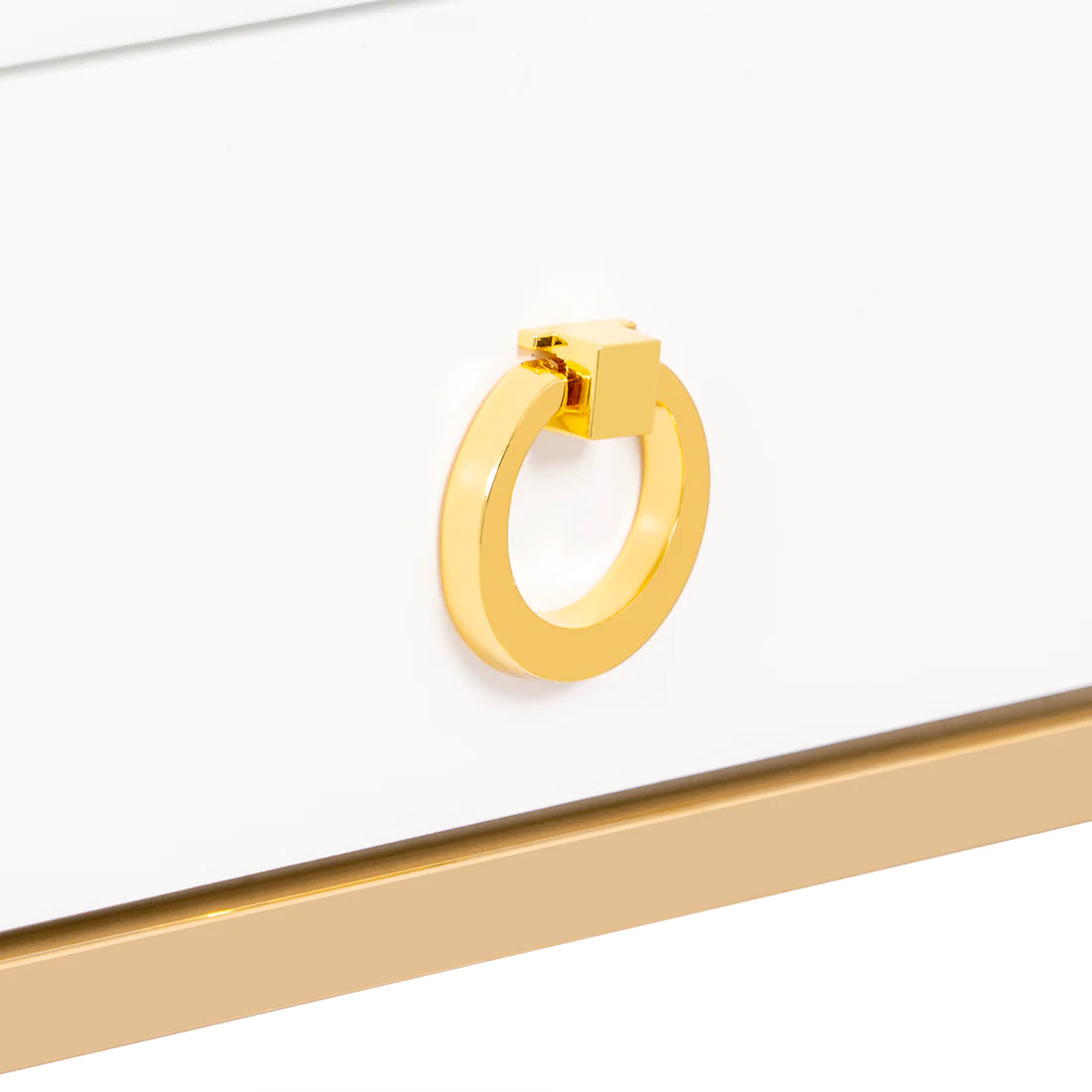There is nothing more classy and regal than the combination of white and gold. Get ready to slay the day with the Skylar SlayStation® Vanity Table. An essential item to add to your glam room and to perfect your makeup routine. This table features three soft-closing drawers that gleam with the beautiful golden knobs. All three drawers are equally sized. This table comes with our unique designed brilliant golden legs.