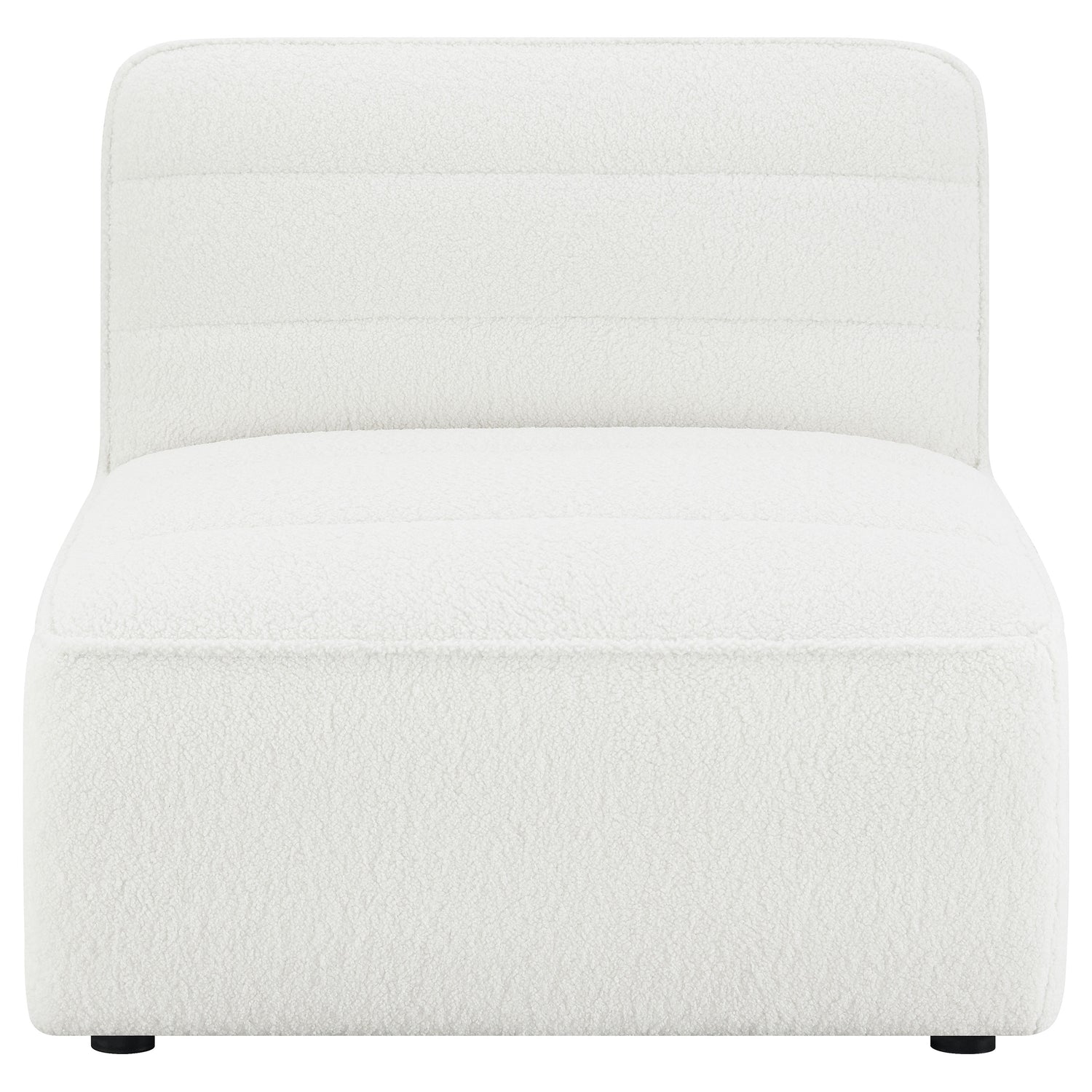 Wrapped entirely in a soft and supple, faux sheep skin upholstery, this contemporary armless chair invites you to kick back and relax in supreme comfort. With a natural light hue, this armless chair also lends itself to current color palettes and allows you to get creative with bold, bright tones. A horizontal channel tufted back and seat create a retro-inspired feel for modern spaces. In addition, the boxy, taut seat and backrest feature pocket coil spring construction for long-lasting support. Black feet peek out from the base, offering a bold contrast.