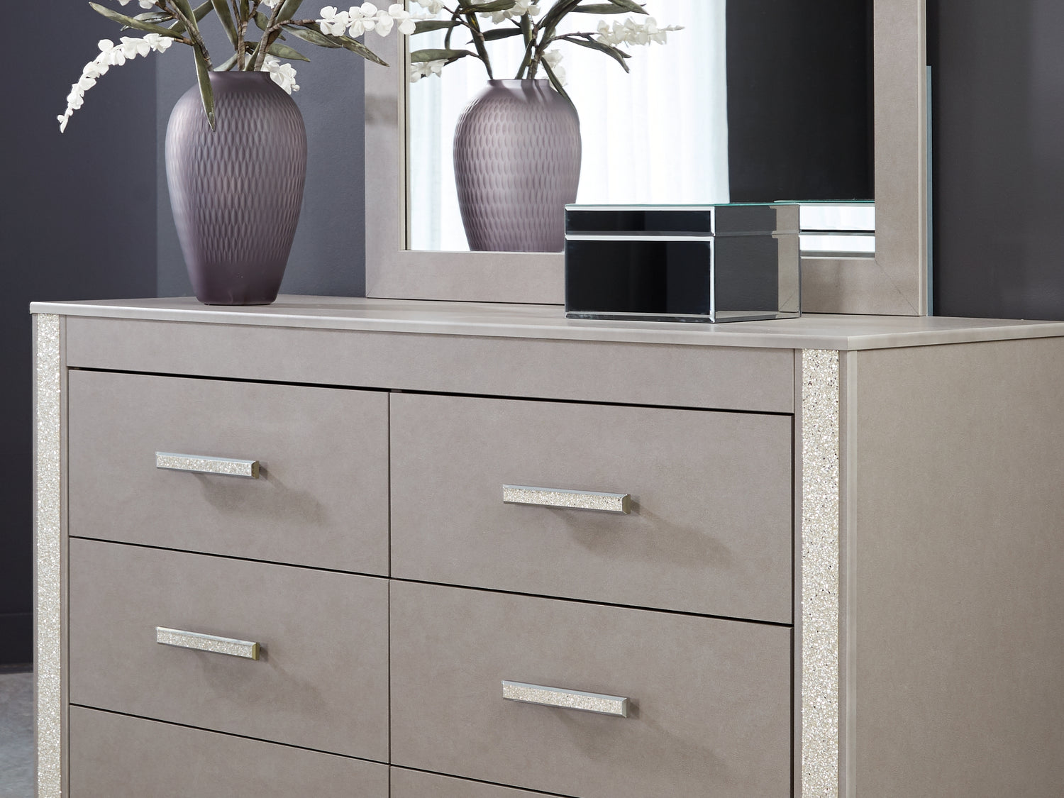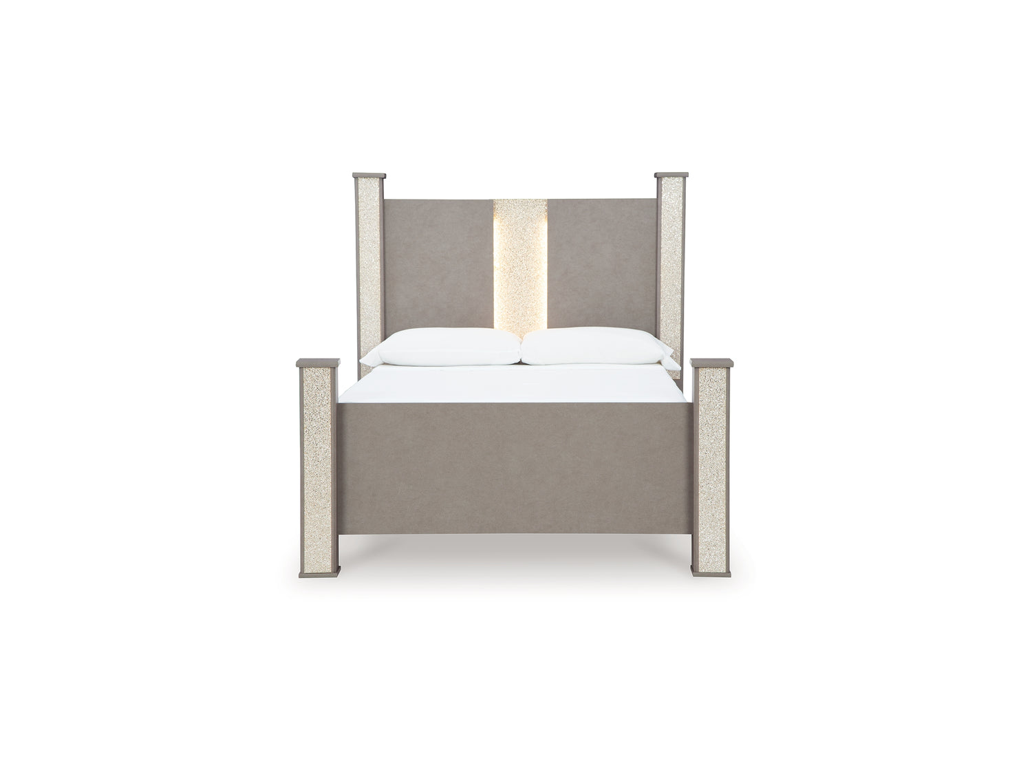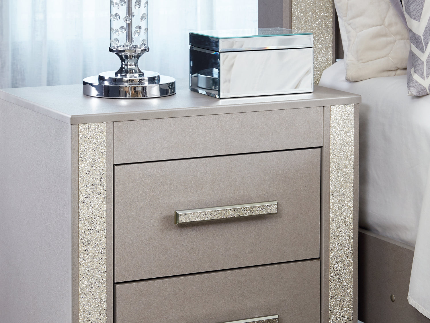 Series Features: Subtle gray finish over replicated leather grain and authentic touch. Cases and bed are accented with glitter details. Large scaled champagne chrome colored handles. Side roller glides for smooth operating drawers. Drawer interiors lined with a replicated linen design for a clean finished look. Queen (57) panel headboard features glitter details accented with LED lighting and include a remote for color and brightness options. Queen (67), king (68) poster headboard panels feature glitter details accented with LED lighting and include a remote for color and brightness options. Poster headboard panels require use of poster headboard posts (62). Queen panel headboard (57) is capable of attaching a full sized metal bolt on bed frame. Queen (57) panel headboard can attach to a bolt-on metal bed B100-31. Both USB and wireless charging options are provided with the night stand. Safety is a top priority, clothing storage units are designed to meet the most current standard for stability, ASTM F 2057 (ASTM International). Drawers extend out to accommodate maximum access to drawer interior while maintaining safety. Assembly required.