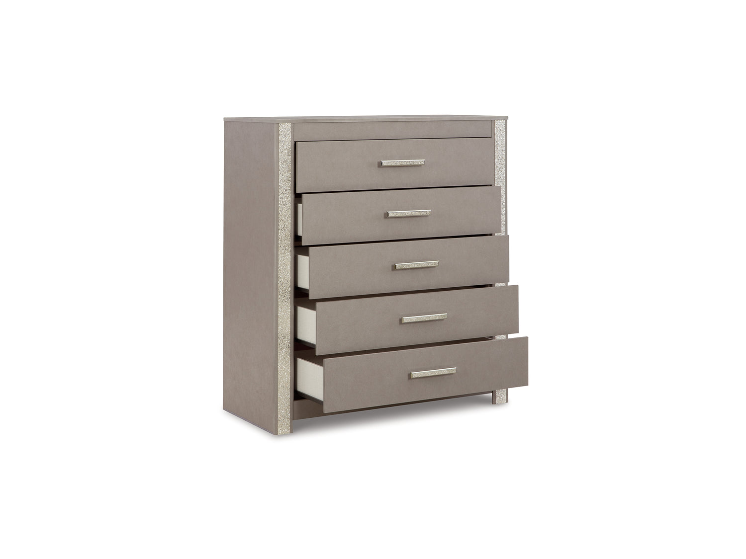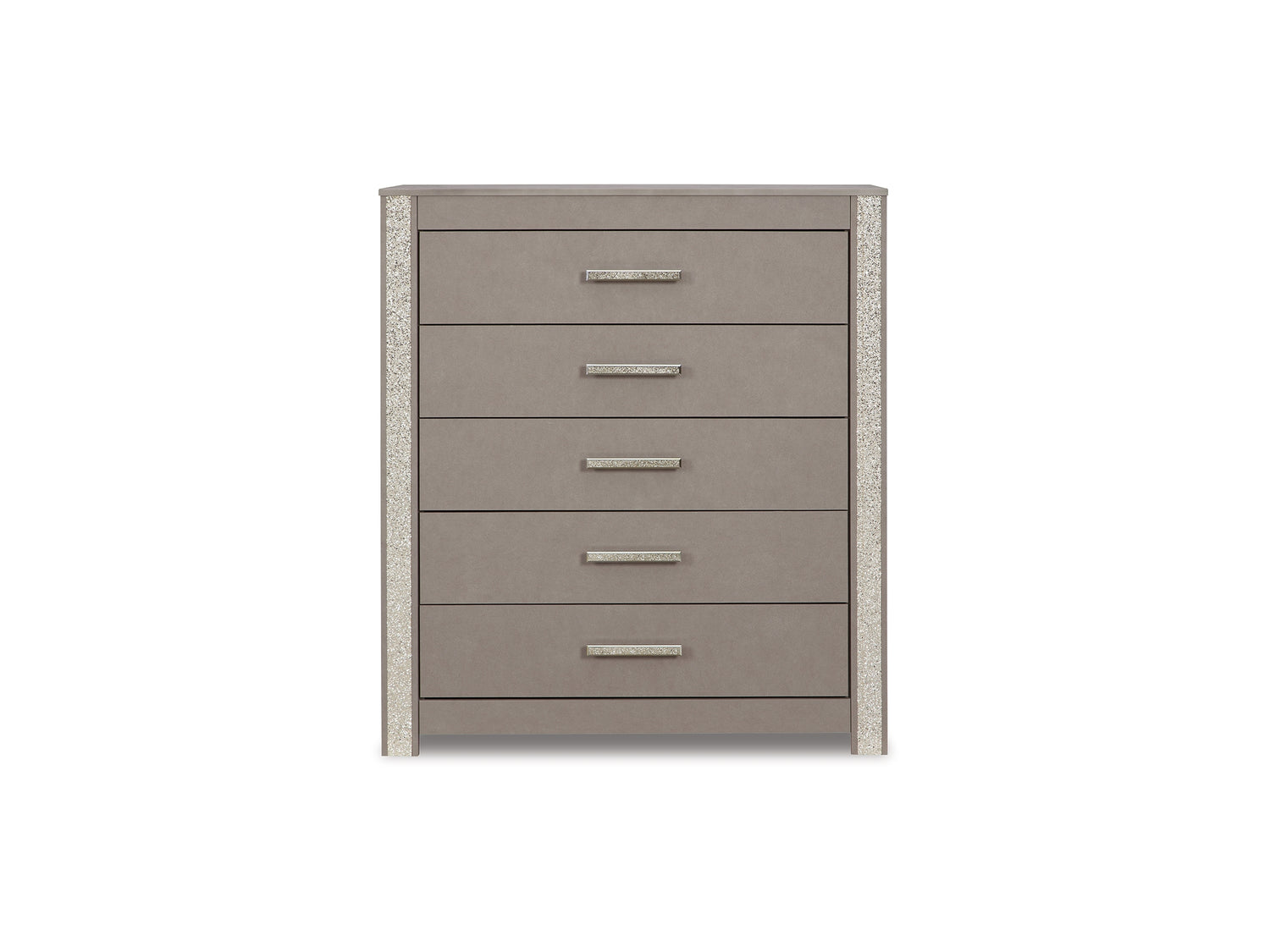 Series Features: Subtle gray finish over replicated leather grain and authentic touch. Cases and bed are accented with glitter details. Large scaled champagne chrome colored handles. Side roller glides for smooth operating drawers. Drawer interiors lined with a replicated linen design for a clean finished look. Queen (57) panel headboard features glitter details accented with LED lighting and include a remote for color and brightness options. Queen (67), king (68) poster headboard panels feature glitter details accented with LED lighting and include a remote for color and brightness options. Poster headboard panels require use of poster headboard posts (62). Queen panel headboard (57) is capable of attaching a full sized metal bolt on bed frame. Queen (57) panel headboard can attach to a bolt-on metal bed B100-31. Both USB and wireless charging options are provided with the night stand. Safety is a top priority, clothing storage units are designed to meet the most current standard for stability, ASTM F 2057 (ASTM International). Drawers extend out to accommodate maximum access to drawer interior while maintaining safety. Assembly required.