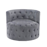 - Material: Solid wood and plywood frame with metal swivel base, Foam padding over pocket coils, Velvet fabric upholstery, Attached back and seat cushions, Button tufted detail, 360-degree swivel, Assembly required, Weight capacity: 300lbs