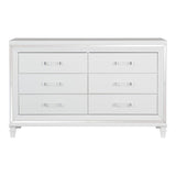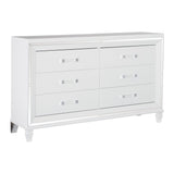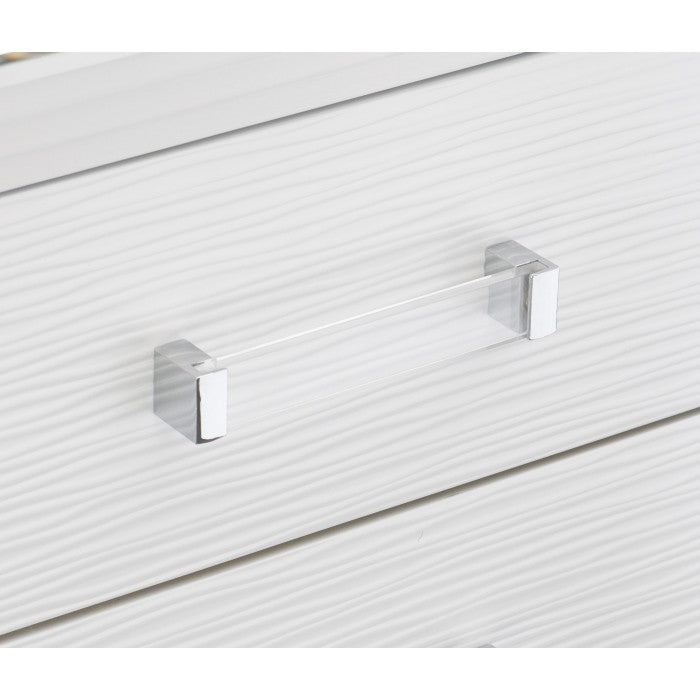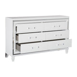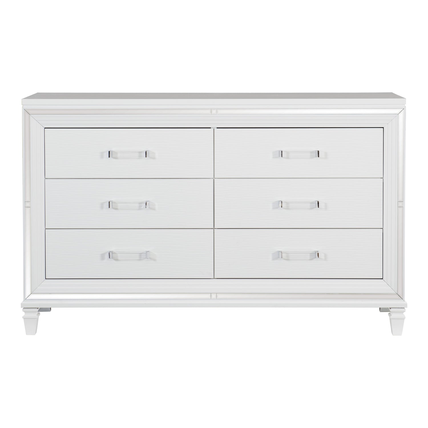 The unique characteristics of the tamsin collection come together to form a fashionable and practical addition to your way of life. this collection was designed to assist your bedroom in realizing its full spectacular potential. the dresser receives a dramatic upgrade in the form of a mirrored framing, which also illuminates the white finish. the dresser's drawer fronts have been given a subtle yet elegant decorative touch with the addition of acrylic hardware. your costly accoutrements can be kept out of sight in the dresser's secret jewelry drawers, which provide ample storage space.