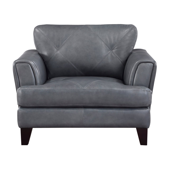 With subtle inspiration from modern European design, the contemporary style of the Thierry Collection pairs understated elegance with defining lines resulting in a sophisticated look for your living room. The burnish-gray hue of the chair’s top grain leather covering – with split-grain leather match – is a neutral decorative selection for your space. Geometric stitching accents the seats of the chair, while the flare of the track arm completes the modern profile.