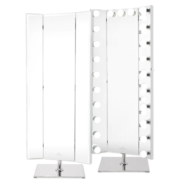 Glamour, warmth and luxury --the trifecta ambience obtained with the all new Trifecta Full Length Mirror. Bordered by a high-quality LED light strip or 23 LED globe bulbs, providing dimmable ultra-bright studio lighting. This trifold vanity mirror adds a touch of elevated radiance to any glam room. (Powered by US standard plug-in cord.)