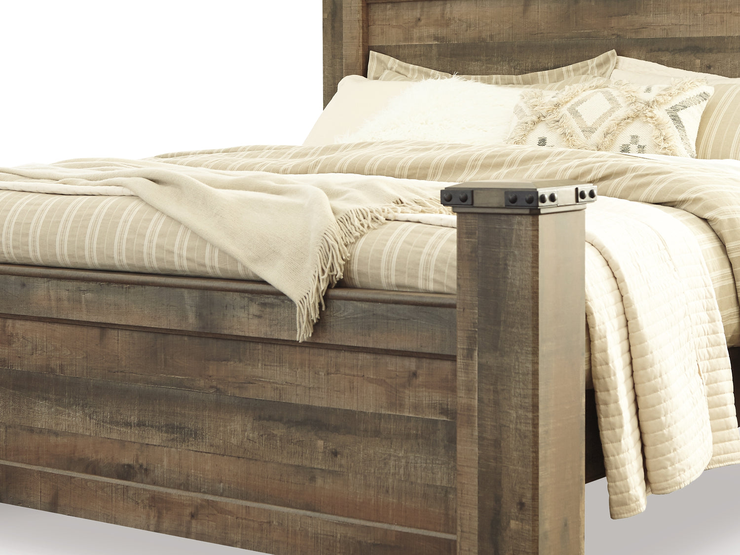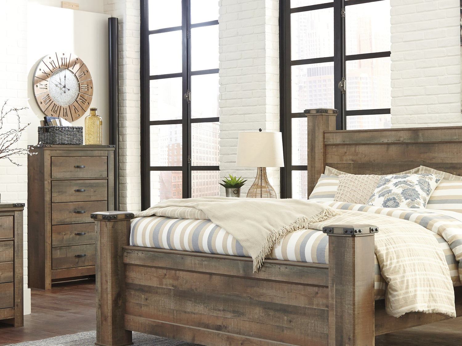 Series Features: Warm rustic plank finish over replicated Oak grain and authentic touch. Tops of cases and headboard/footboard panels are captured with a nail trimmed corner piece. Rolling trundle storage box enables the option of storage or bed. Side roller glides for smooth operating drawers. Handles feature nailhead trim in a dark bronze metal finish. Slim profile dual USB charger located on the back of the night stand tops. B100-11, B100-12 can be used in substitution of a box spring on the twin or full panel beds. Poster bed offers optional footboard storage. Safety is a top priority, clothing storage units are designed to meet the most current standard for stability, ASTM F 2057 (ASTM International). Drawers extend out to accommodate maximum access to drawer interior while maintaining safety.