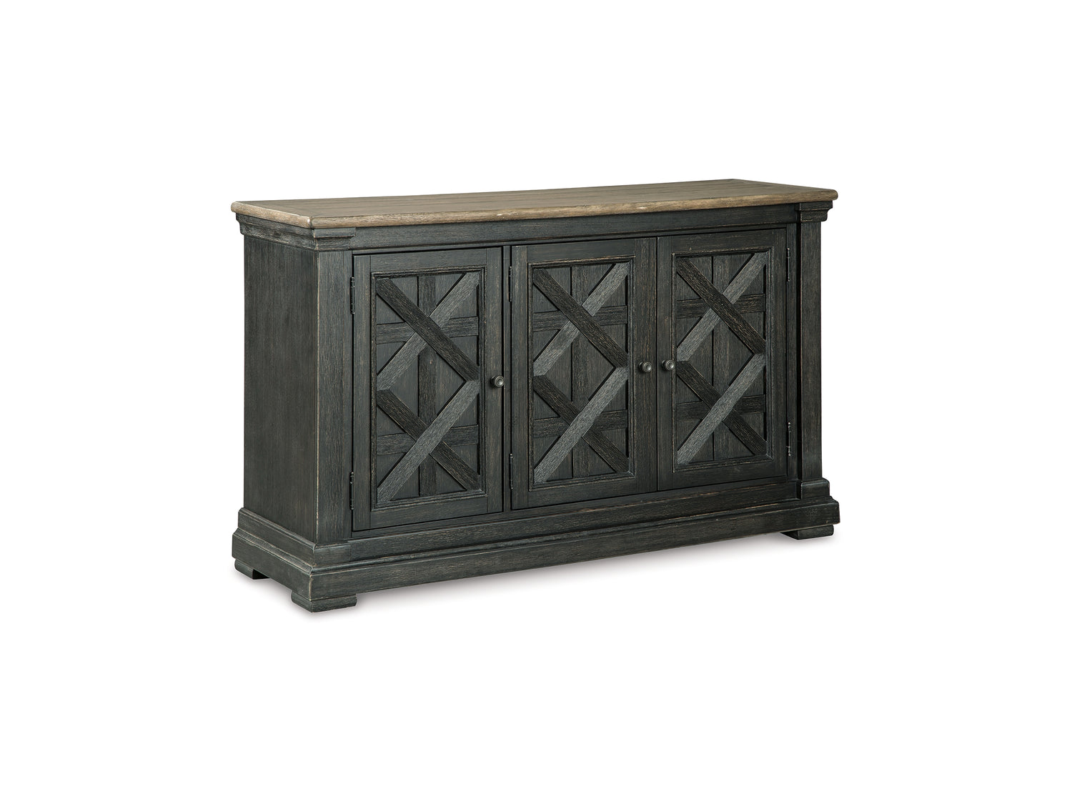 Series Features: Unique two-tone finish with a combination of Oak and Acacia substrates combining a trendy textured antique black color with table and server tops finished in a textural weathered oak finish. Rectangular dining table features six convenient drawers for storing smaller items. The -02 upholstered host chair inspired by the trendy deconstructed styles for casual living. The -01 side chairs feature a boxed cushioned seat. All chairs feature a heavy woven grayish brown fabric for added textural qualities. The large capacity server has three doors with lattice design. The tall bunching unit has two drawers, three shelves and open lattice sides.