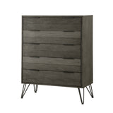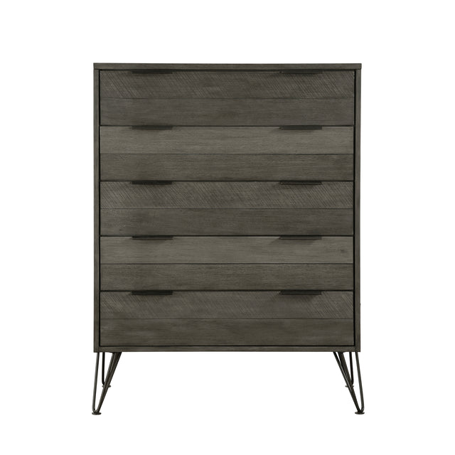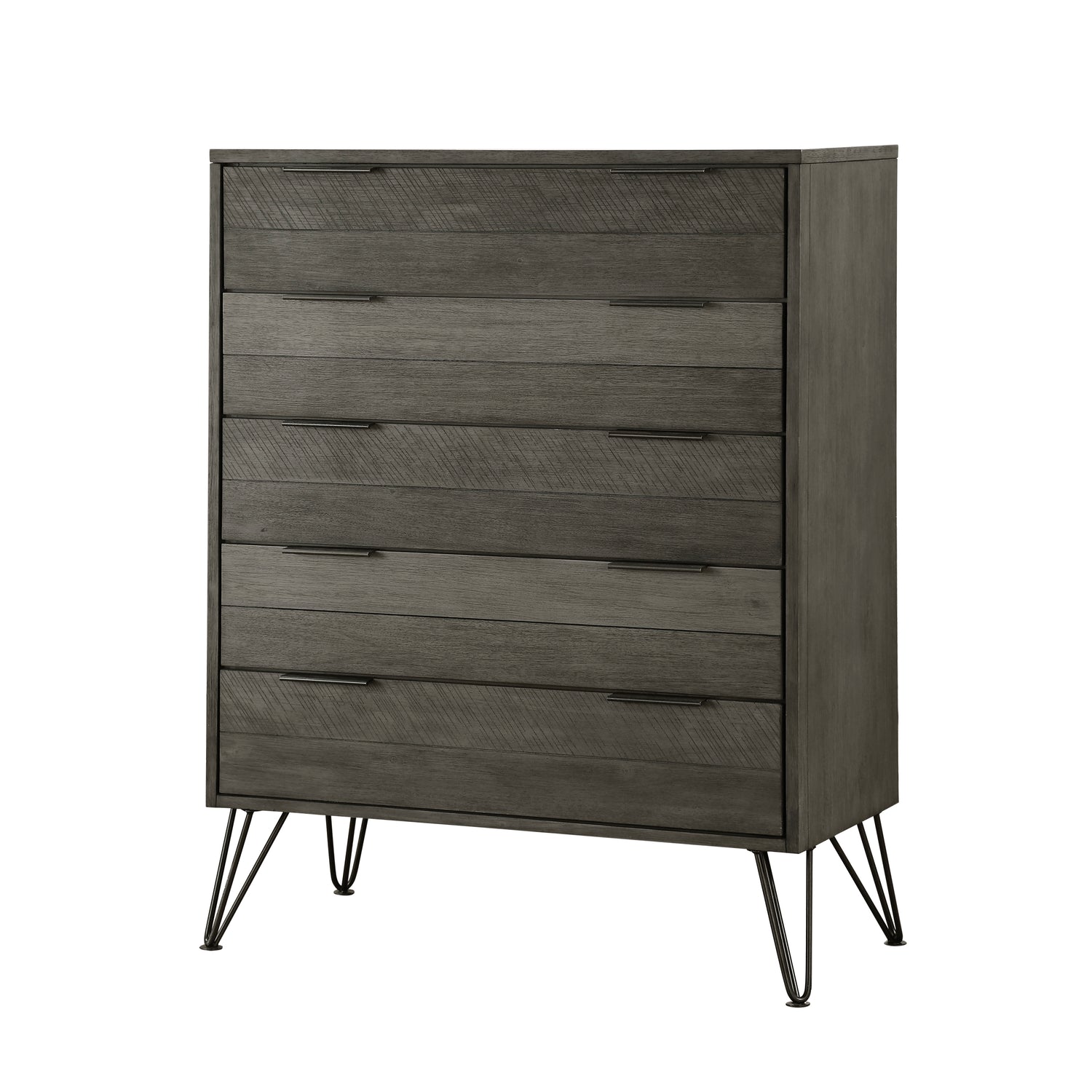 The urbanite collection is the ideal representation of your love for modern style because it is perched atop metal legs, which together provide a bold statement of current styling. acacia wood, both solid and veneered, is used to construct the chest, and it features a three-toned grey treatment that brings out the natural variation in the wood's grain. the sleek, modern appearance is contributed to by elements like as the horizontal slat design, the configuration of five drawers, and the metal pull tab hardware.