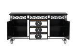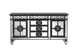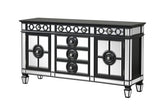 Server Storage: 6 Drawers, 2 Doors (Inside 2 Compartments w/1 Wooden Shelf) Wooden Top & Frame, Raised Geometric Trim, Beveled-Mirror Inlay (Door/Drw/Case), Tapered Leg CONSTRUCTION] Wooden Frame: Beveled Mirror, Wood (Poplar+Rbw), MDF Mirrored Tapered Leg Drawer: GLIDE Side Metal, HARDWARE: Single Crystal-like Pull-Knob (Sunburst Molding)