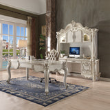 The Versailles collection classic style will blend masterfully in your home. The storage feature offers plenty of space to keep your office supplies, this set includes four top doors to reveal extra storage available. Carefully constructed from selected wood and veneers in rich Bone White and Hand Brushed Antique Finish. Highly decorative details, oversized crown, claw feet and decorative scrolled moldings on doors, gives this piece an elegant and sleek appeal.