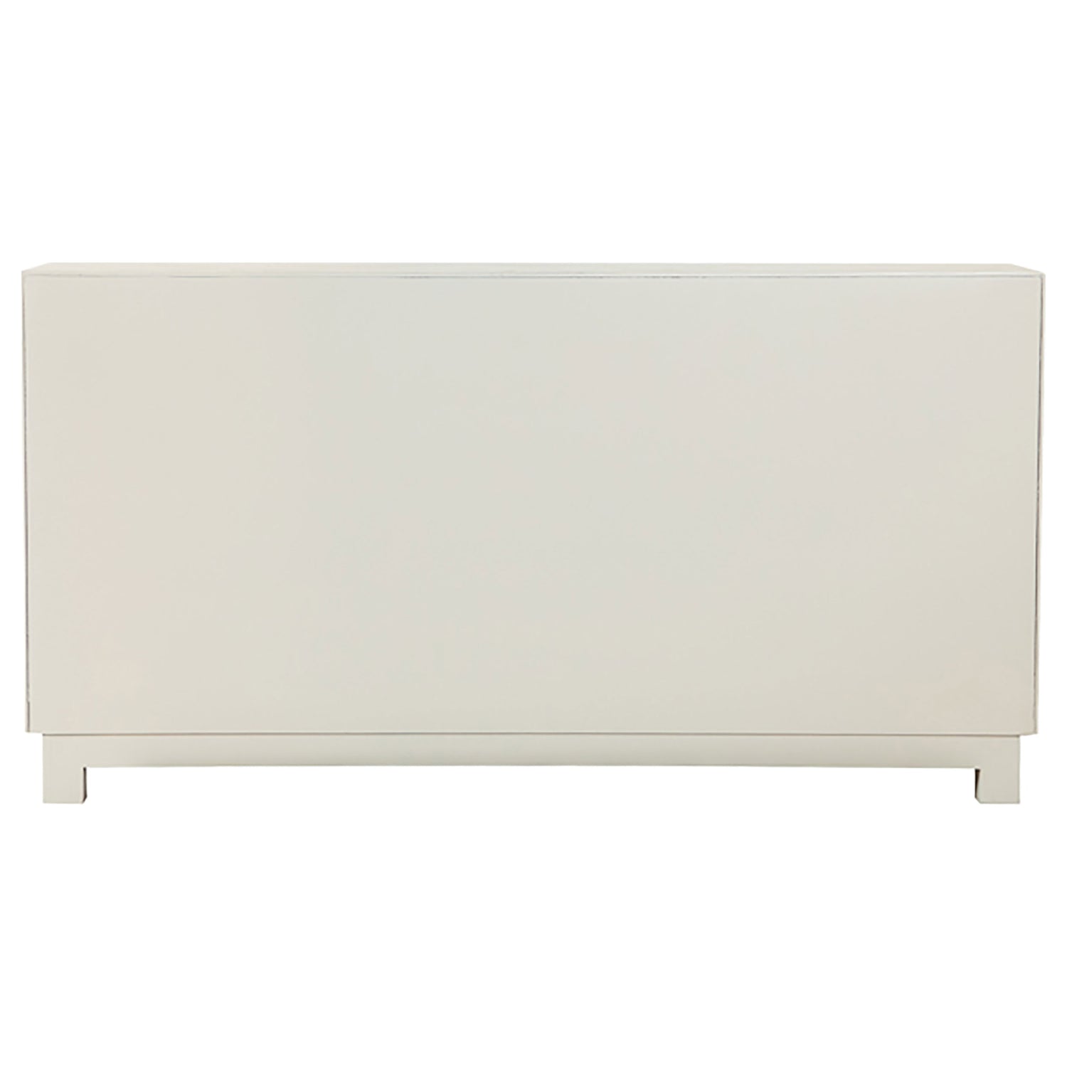 For an accent table that strikes up an instant conversation, you can't go wrong with this piece. A Greek key design on the cabinet door panels add texture and pizzazz. The white, gold, and silver color palette makes an immediate upgrade inside your home. Find plenty of storage space within the four cabinet doors and three interior shelves inside. This accent cabinet is supported on block style legs.