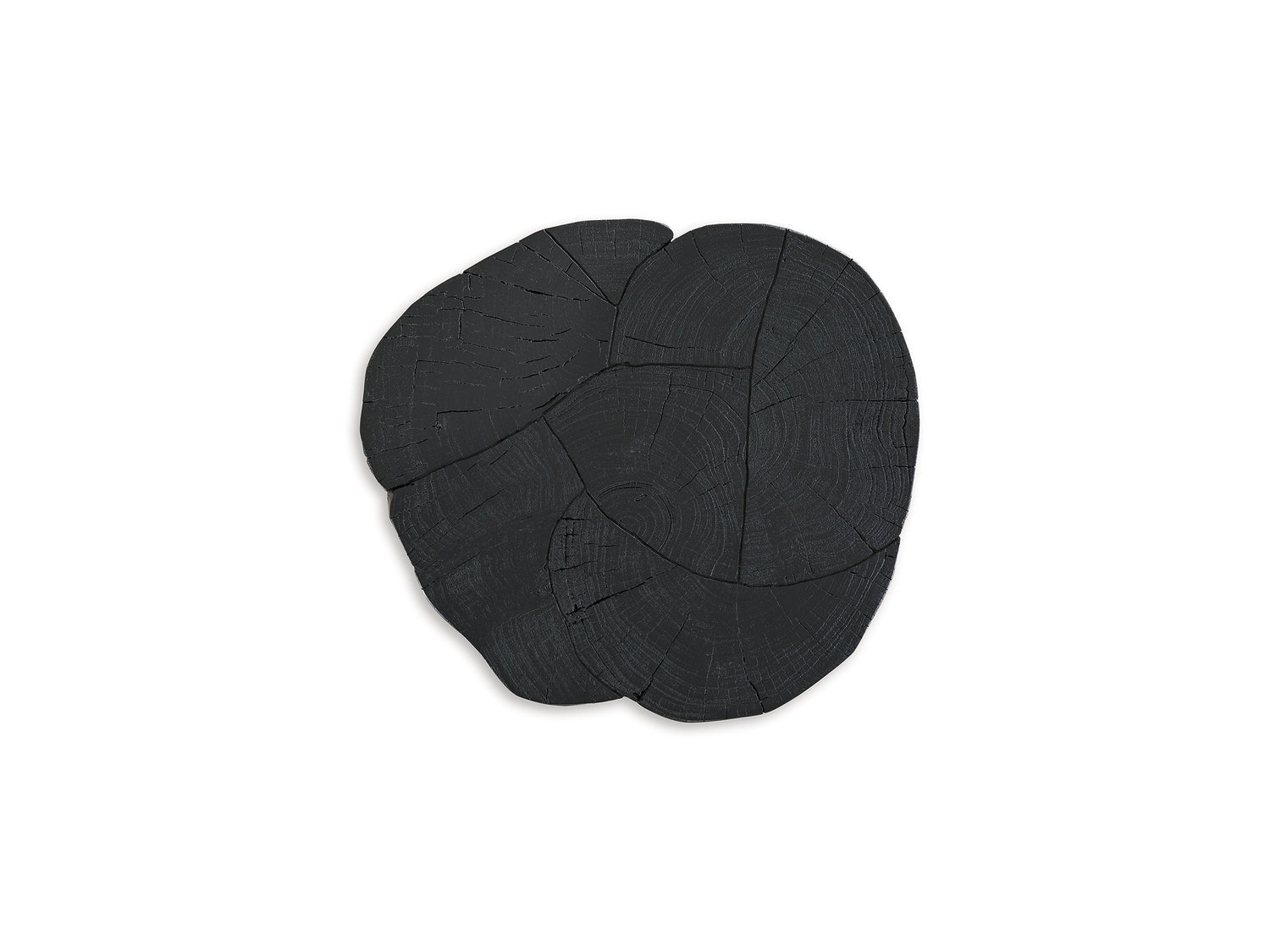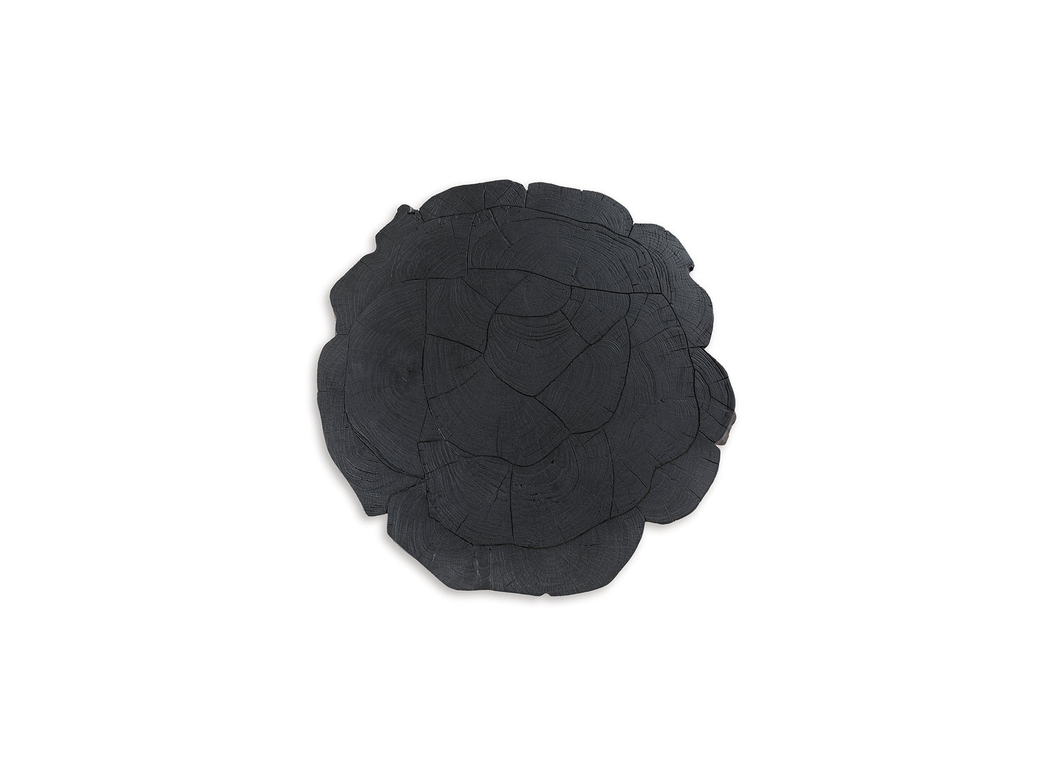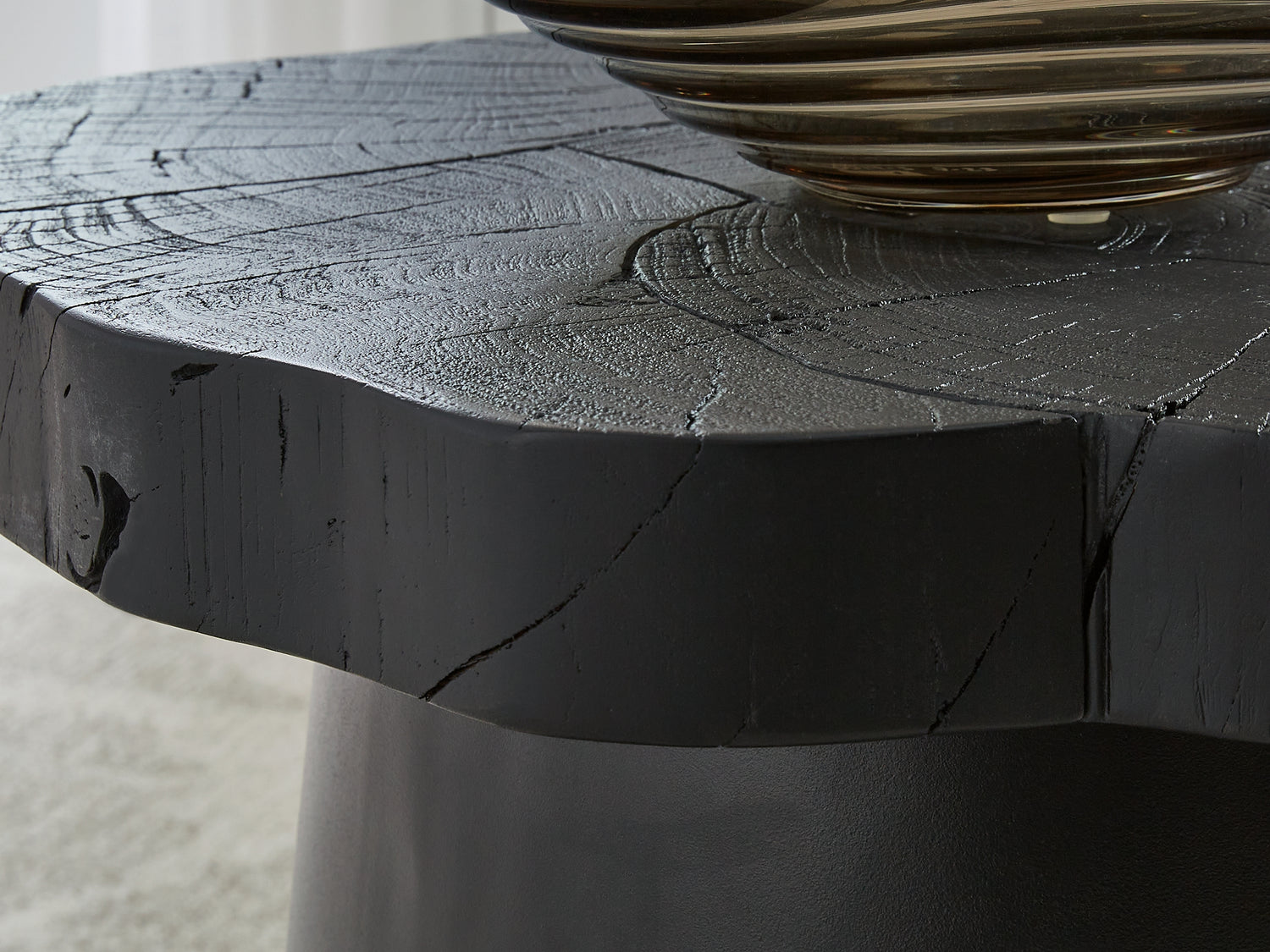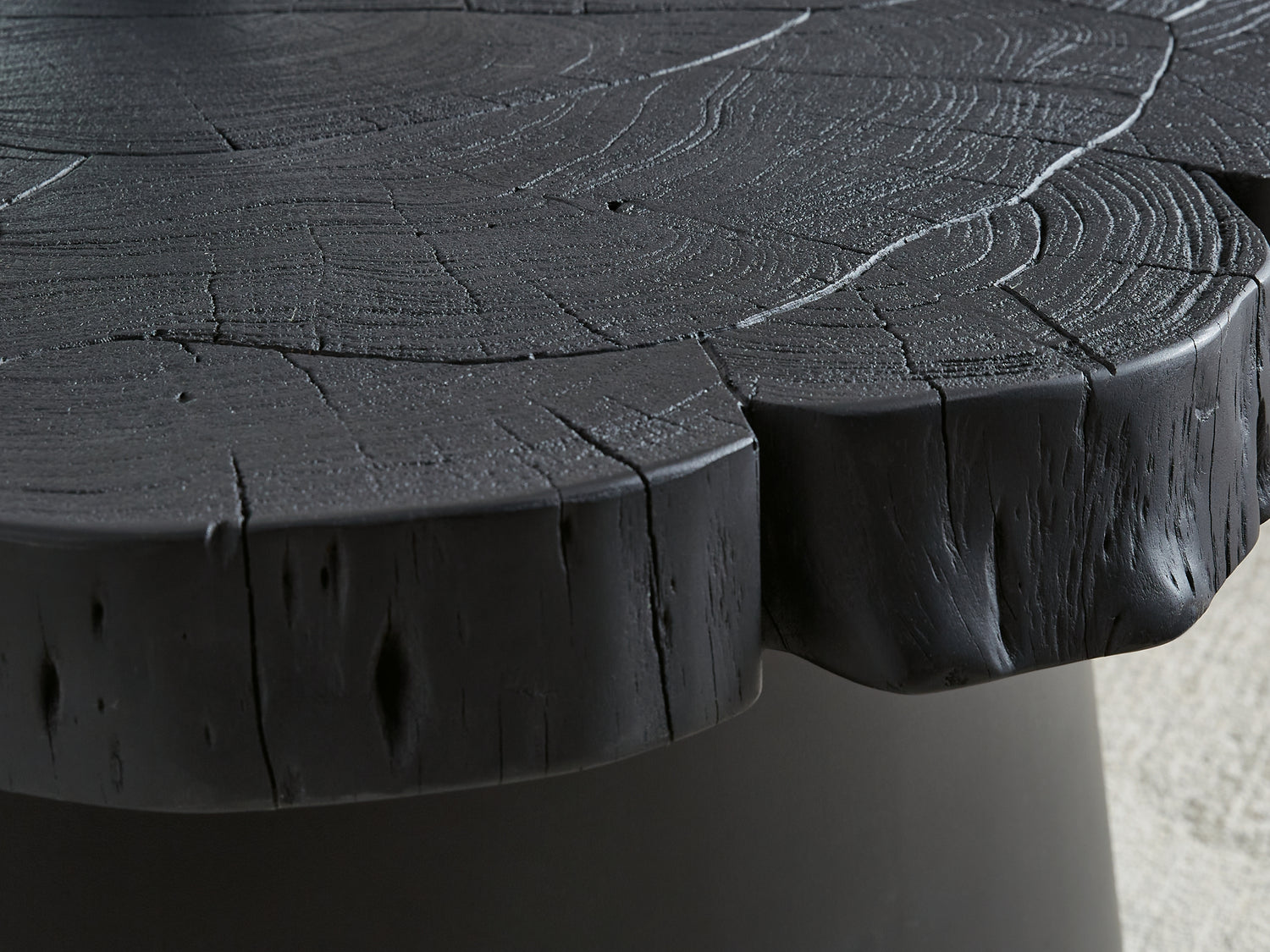 Series Features: Contemporary design. Constructed of solid acacia wood and metal. Black finish. Thick, round live edge with grooved pattern top. Slightly tapered metal base.