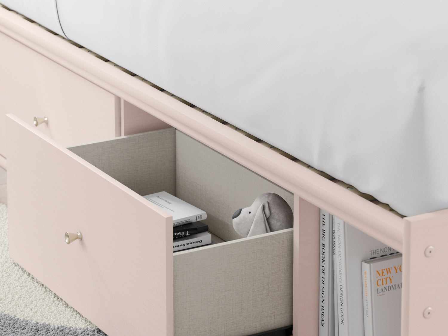 Series Features: Subtle blush finish over replicated pecan wood grain. Inset drawers with champagne colored knobs. Side roller glides offer a smooth opening and closing of the drawer. Drawer interiors are lined with a replicated linen design for a clean, finished look. All cases feature cylindrical legs. Slim USB charger located on the back of the night stand tops. Twin (53) and full (87) upholstered headboards can attach to a bolt-on metal bed frame B100-21. Bed panels (52,84) require the use of twin/full platform rails (89) and roll slats (B100-11, B100-12). All side storage options (50,150) requires the use of the B100-11, B100-12 roll slats. All under bed storage units (50,150) accommodates to 10.5"W x 10.5"D x 11"H cube storage bins. Mirror (36) has the versatility to mount on the dresser or to the wall horizontally or vertically. Minor assembly required. Safety is a top priority, clothing storage units are designed to meet the most current standard for stability, ASTM F 2057 (ASTM International). Drawers extend out to accommodate maximum access to drawer interior while maintaining safety.