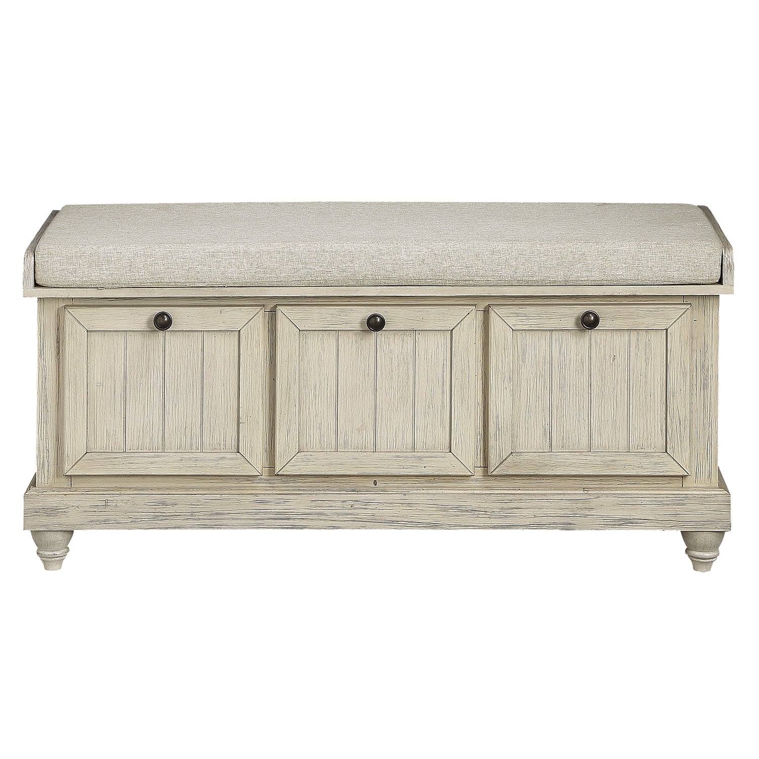 Your home will benefit from the addition of the woodwell collection's utilitarian pieces. this lift-top storage ottoman has false drawer fronts functioning as the foundation of the ottoman. while you are getting ready for your day-to-day activities, you can sit comfortably on a beige-colored padded seat with a neutral tone. the contrast between the finish and the knob hardware is created by the antique white with gray rub-through.