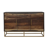 An outstanding handcrafted wood accent table from India, this piece flaunts a range of natural wood colors. Two cabinet drawers boast sleek gold bar pulls. Meanwhile, two center drawers offer additional storage space. The gold geometric base ties the entire look together. Use this piece in eclectic style living spaces.