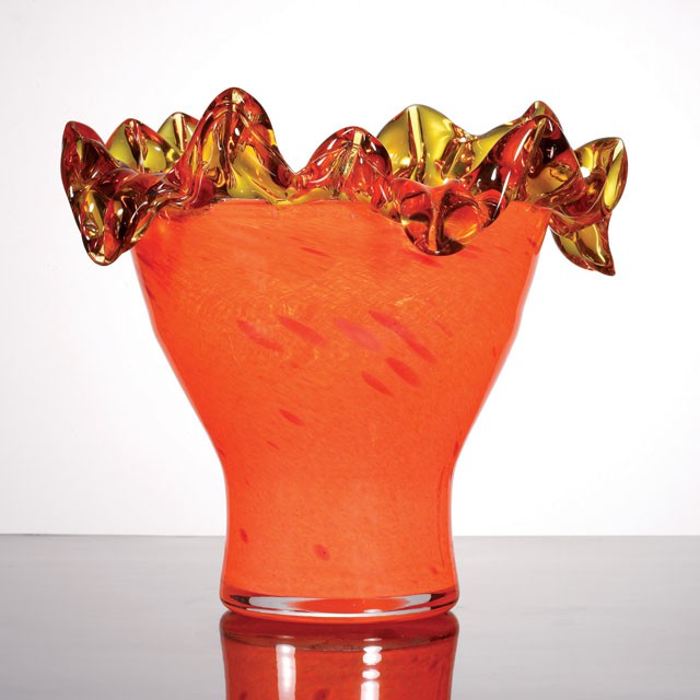 The beautiful texture on the rim gives life to the simple silhouette of this decorative bowl. Available in fiery orange or frozen blue.