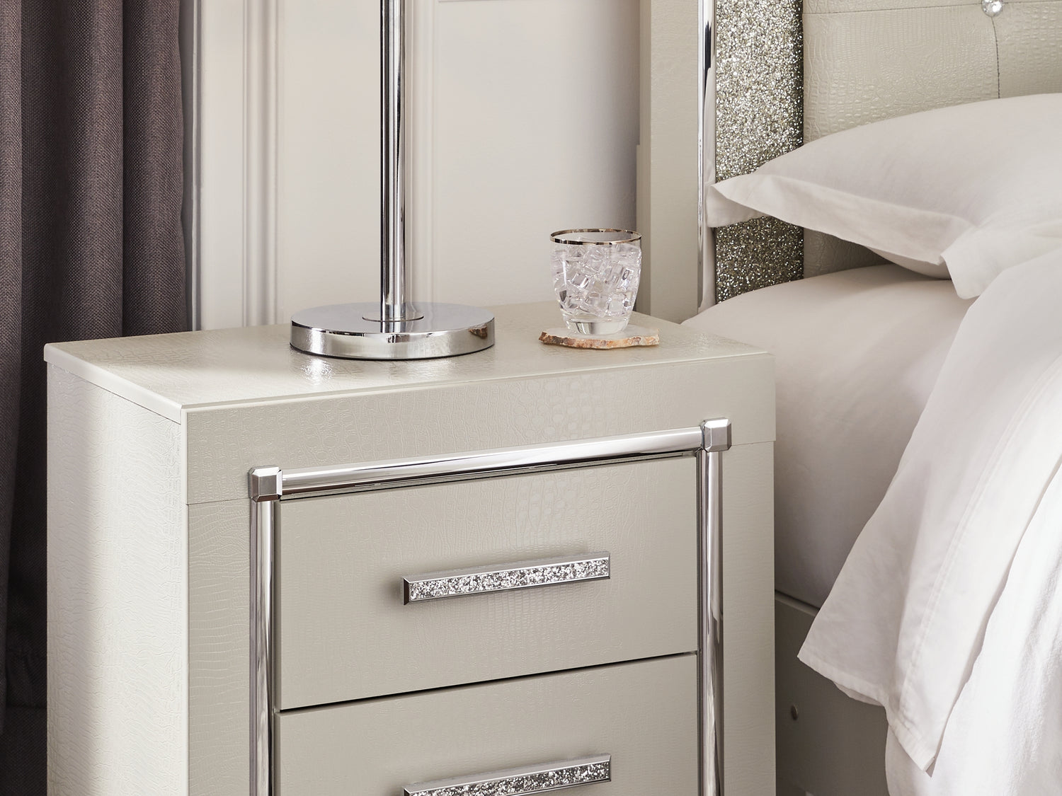 Series Features: All over silver pearl finish faux gator. Cases and bed are accented with faceted chrome details. Dazzling faux crystal accented handles. Headboard features LED lighting and includes a remote for color and brightness options. Included remote holder discreetly keeps light remote accessible. Headboards are accented with faux crystal tufts on a faux gator silver upholstery and glitter inlays. Side roller glides for smooth operating drawers. Drawer interiors are lined with a faux linen laminate for a clean finished look. Both king (58), queen (57) and full (87) panel beds work with panel footboard (54,56,84) respectively. Full (87), queen (57) and king (58) headboards can attach to a bolt-on metal bed B100-21, B100-31 or B100-66 respectively. Queen (57) panel headboard is capable of attaching a full sized metal bolt on bed frame. Both USB and wireless charging options are provided with the nightstand. Mirror (36) has the versatility to be mounted on dresser or wall horizontally or vertically. Safety is a top priority, clothing storage units are designed to meet the most current standard for stability, ASTM F 2057 (ASTM International). Drawers extend out to accommodate maximum access to drawer interior while maintaining safety. Minor assembly required.